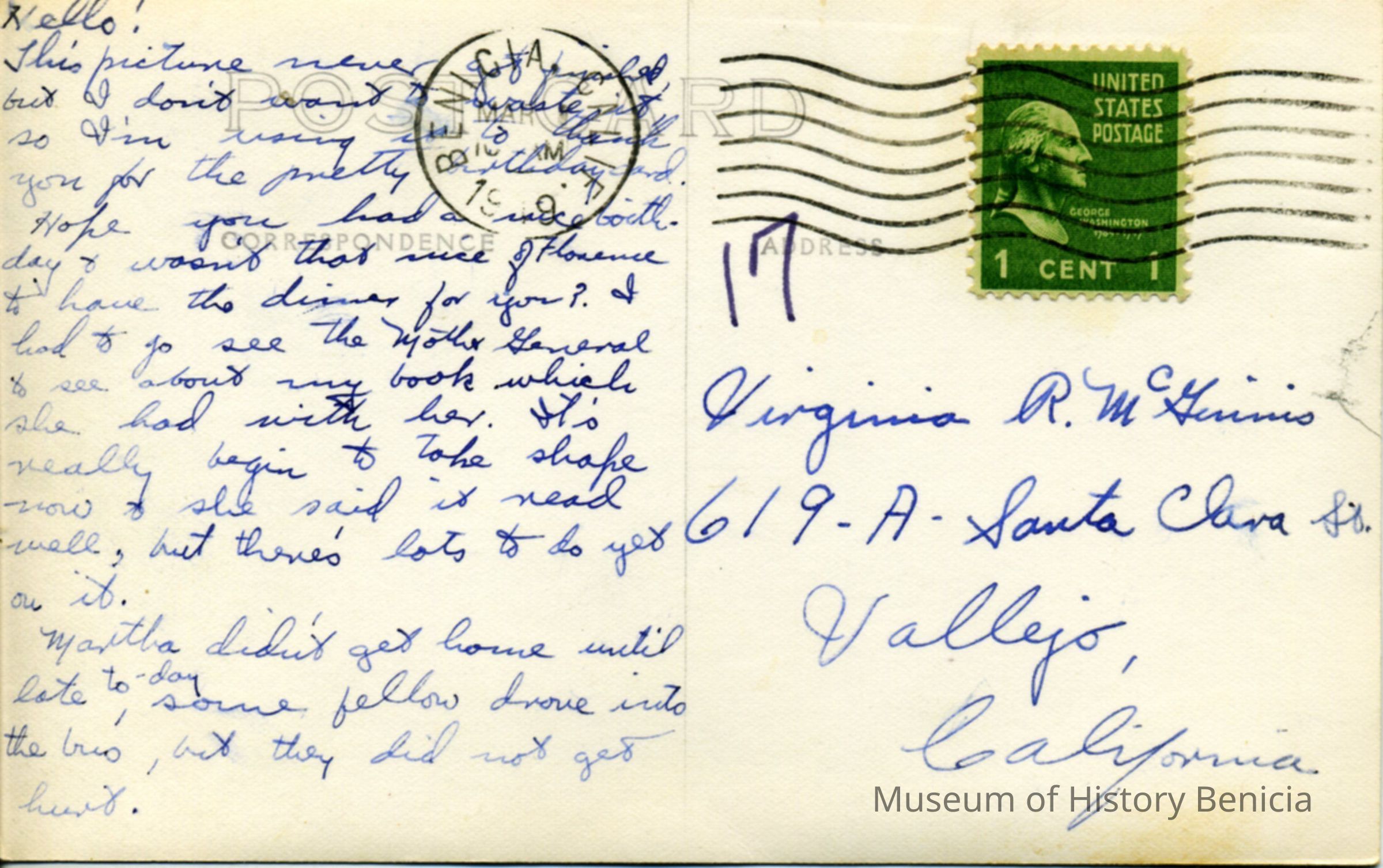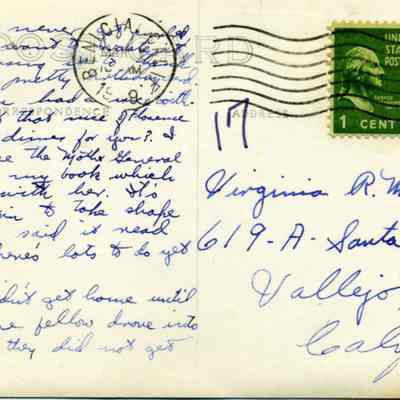 Postcard sent to Virginia R. McGuines? in Vallejo, California
