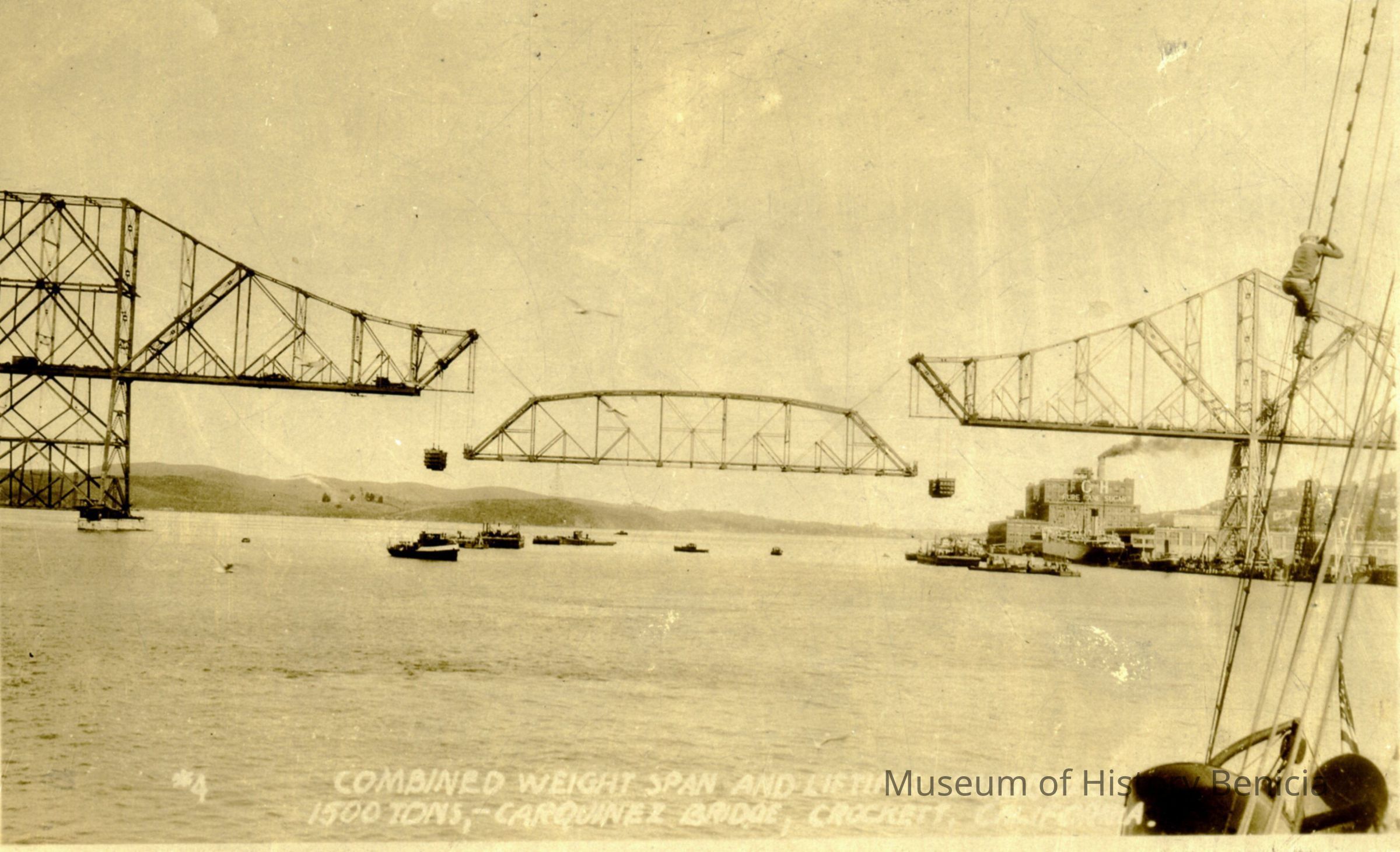 This is a divided back real-photo postcard of the building of the Carquinez bridge. It shows the center span being lifted into place. Notice the man in the rigging on the right and the C&H sugar plant in the background. Inscription says the weight of the span is 1500 tons. The back is blank.Collection