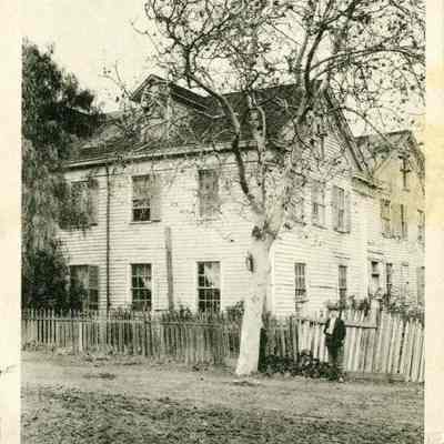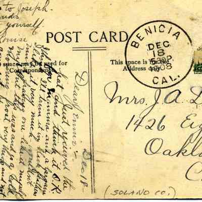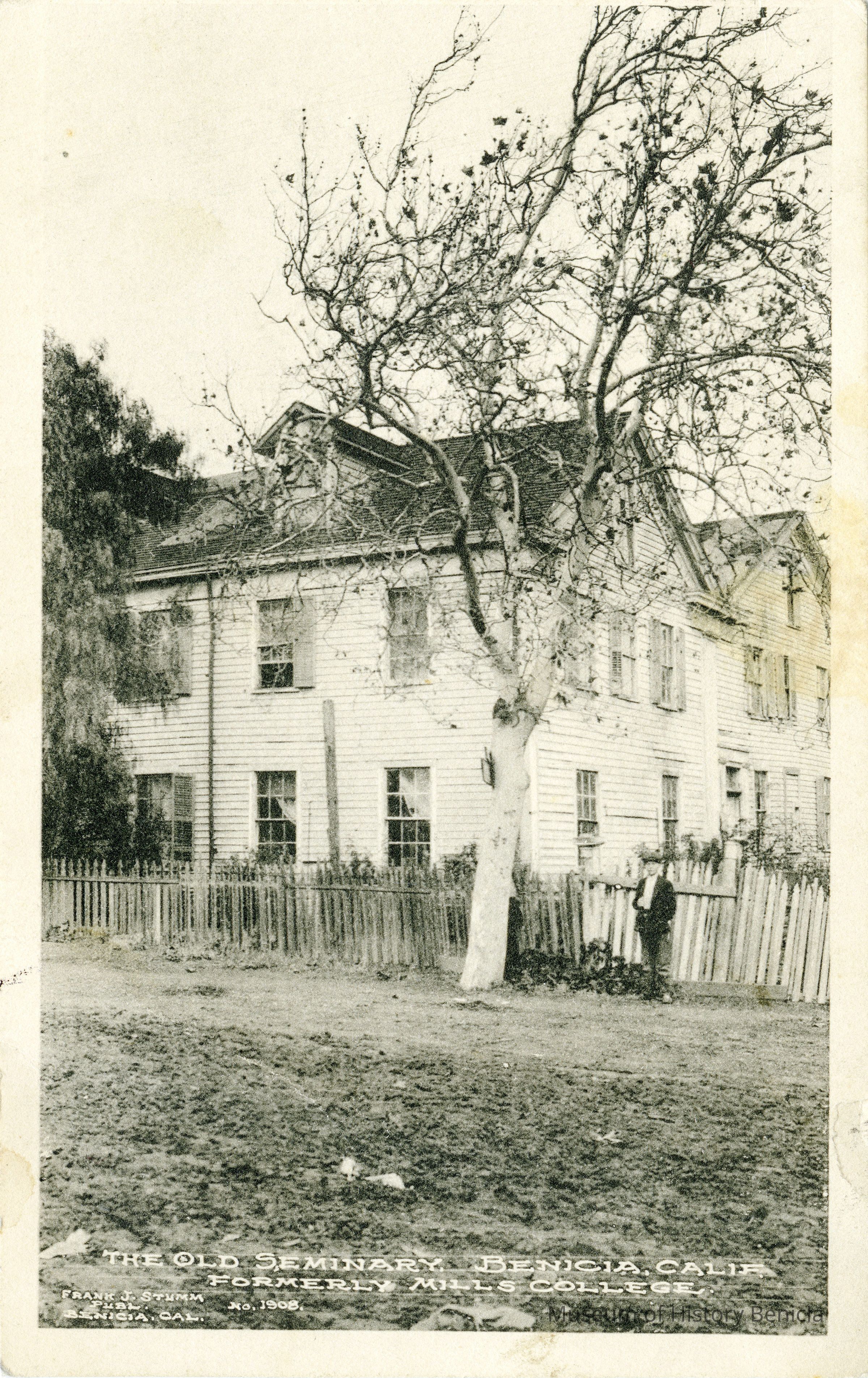 This is a divided back postcard. The photo is of the "Old Seminary" in Benicia CA. This refers to the Young Ladies Seminary in Benicia which is related to Mills College. The card was published by Frank J. Stumm of Benicia, CA. The back is addressed to Mrs. J. A. Dieves of Oakland, CA. The message talks of a new hat for "Mama" and the weather.Collection