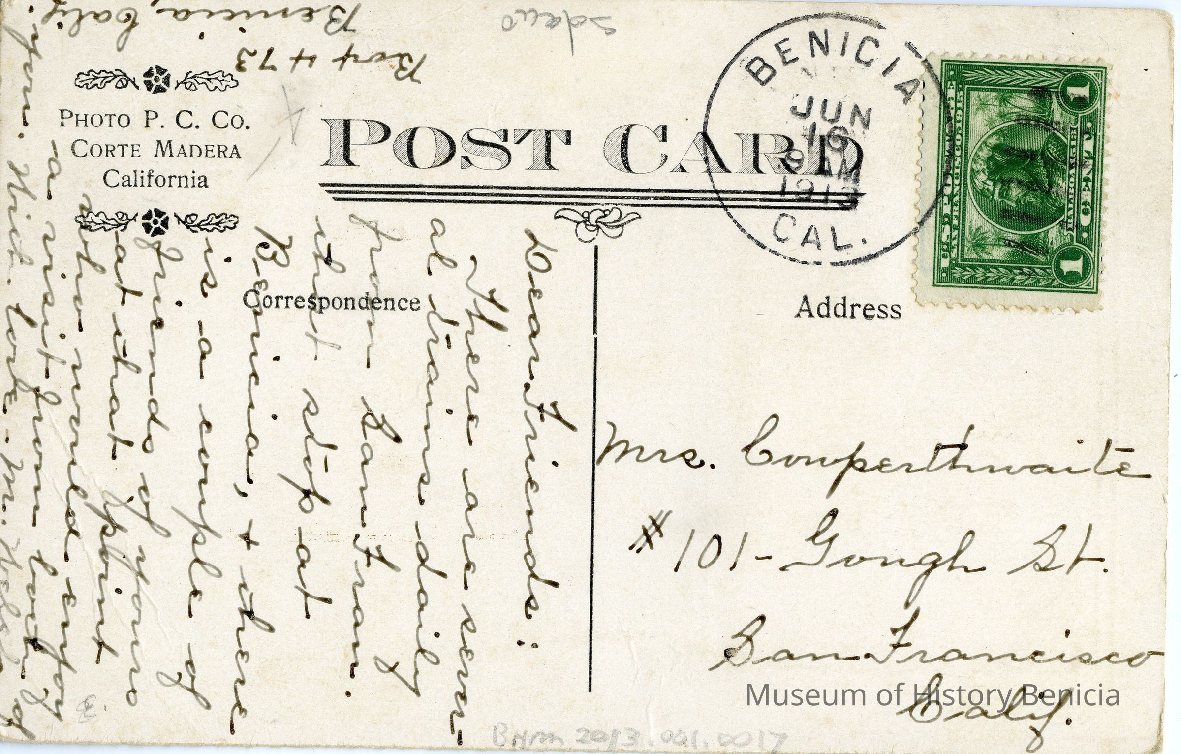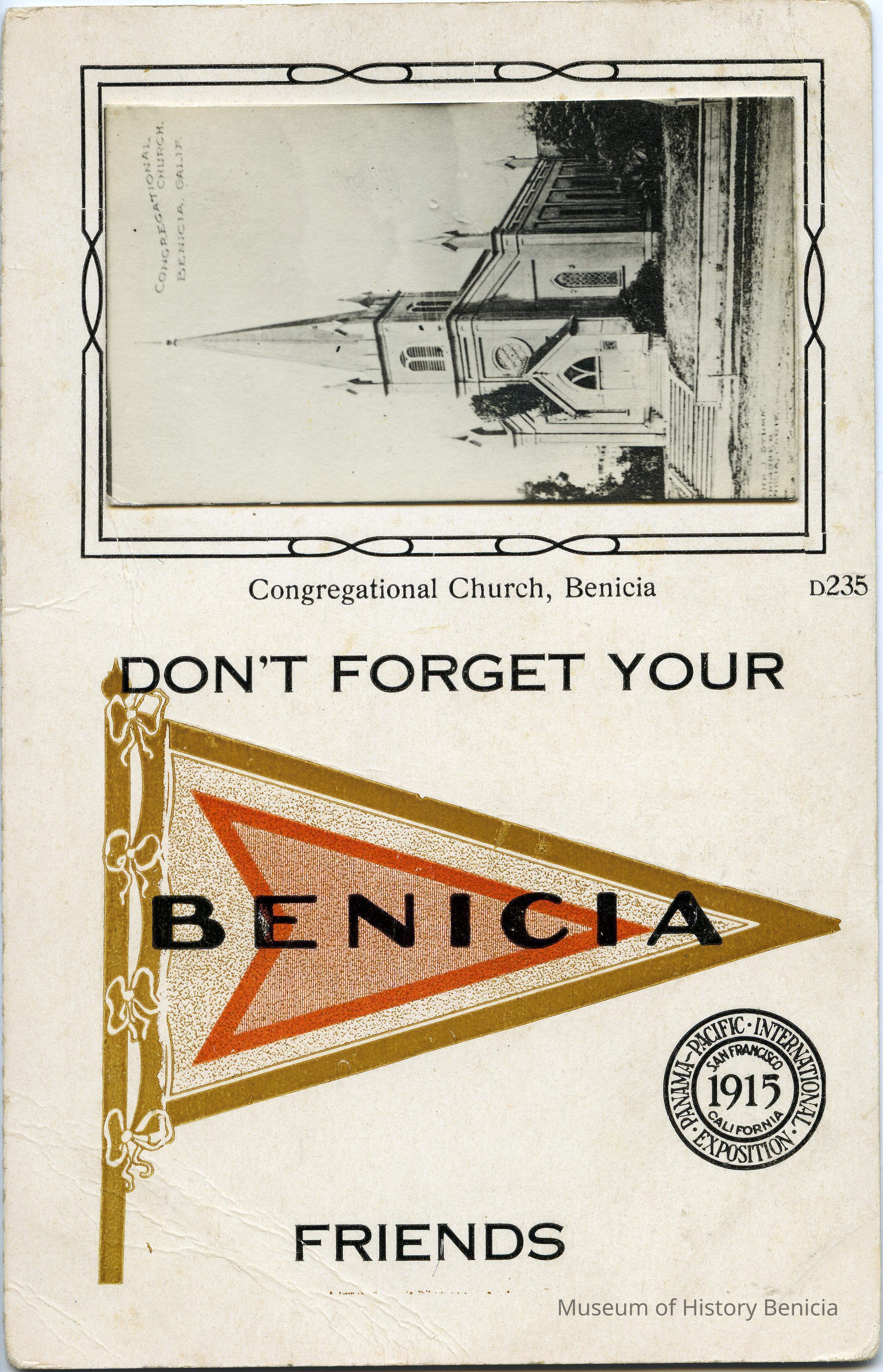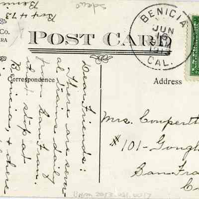 This is a postcard sent to Mrs. Cowperthwaite in San Francisco. It is from Mr. Walsh. He is encouraging his friends to take the train to Benicia. The front of the postcard has a Benicia pennant and a stamp for the 1915 Panama Pacific International Exposition. Pasted to the front is a photograph of the Congregational Church in Benicia taken by Frank Stumm.Collection