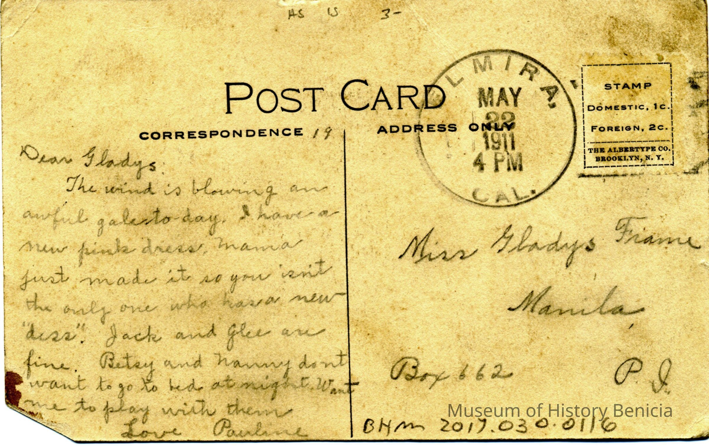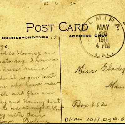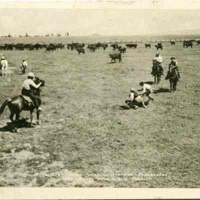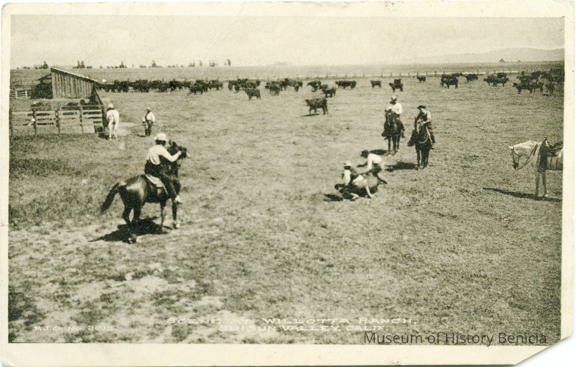 This is a divided back postcard of the Willotta Ranch in Suisun Valley, CA. It shows a cowboy branding cattle. It is published by Frank J. Stumm of Benicia. It is addressed to Miss Gladys Frame in Manila. The back tells of family business.Collection