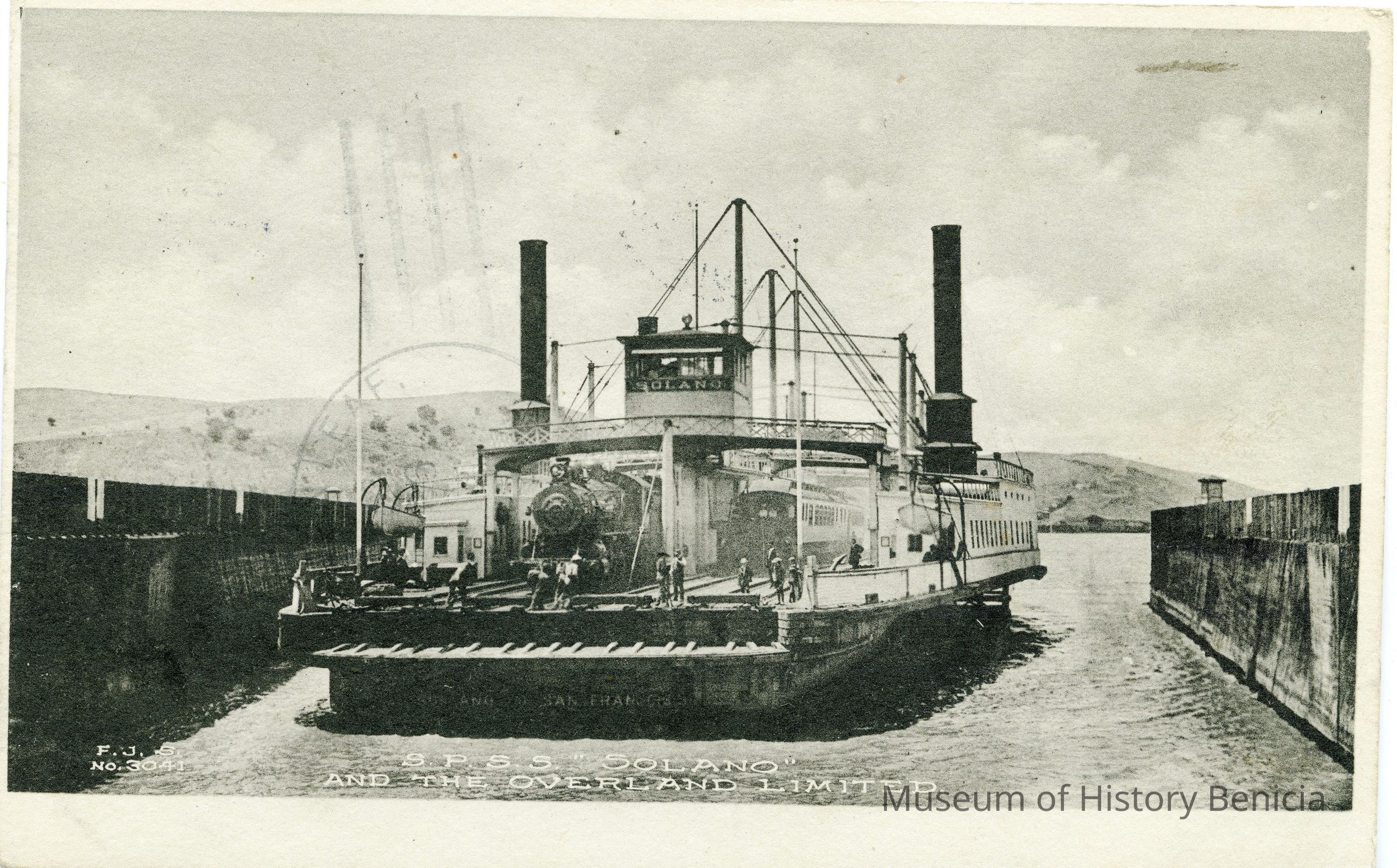 This is a divided back postcard of the ferryboat "Solano" in port. The card has a white space on the bottom. The publisher is Frank J. Stumm.
