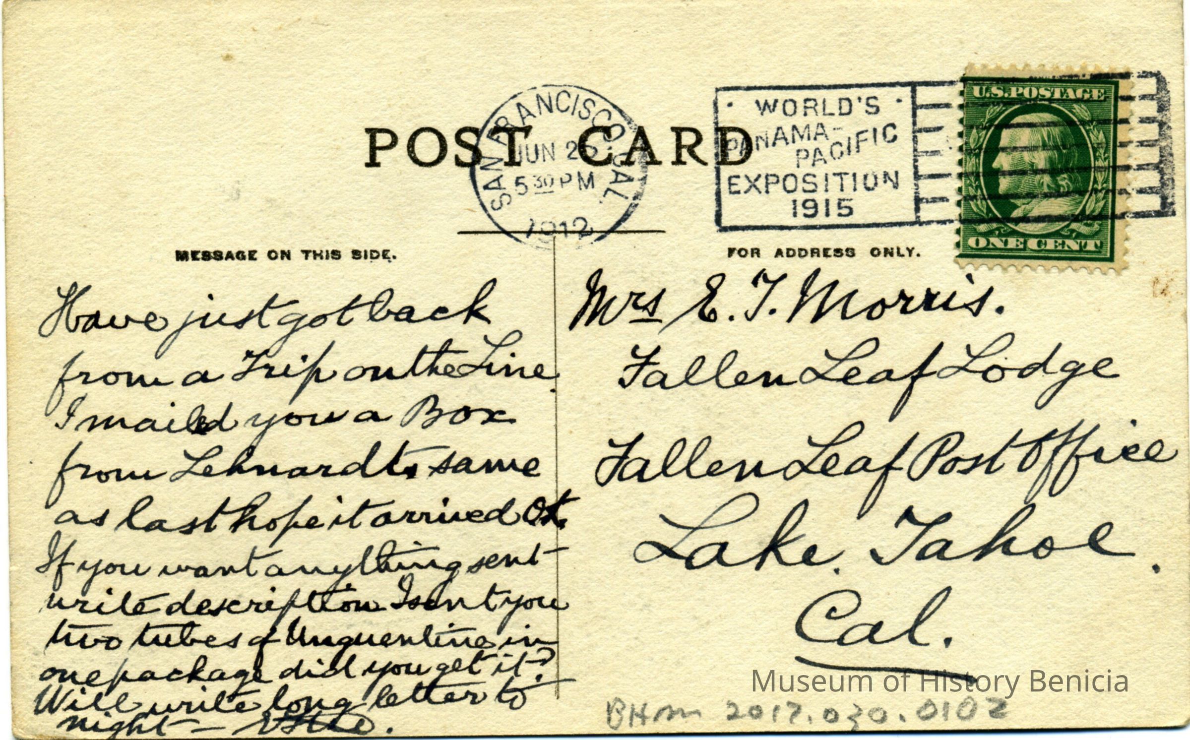 The card is addressed to Mrs. E.J. Morris in Lake Tahoe, CA. It is just telling family that they just got back from a trip and that they mailed packages to them.