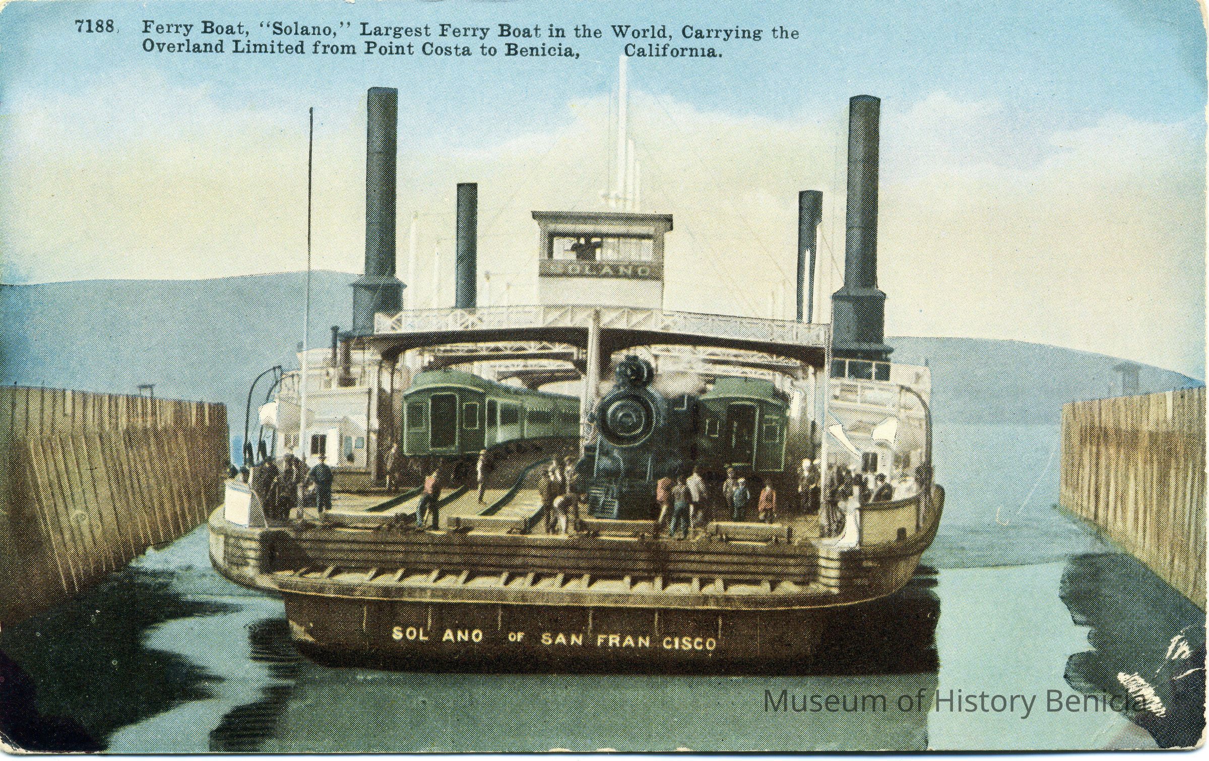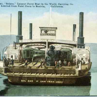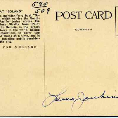 This is a divided back real-photo postcard of the ferry boat Solano in port in Benicia. The caption on the front says "Ferry Boat "Solano" Largest Ferry Boat in the World, Carrying the Overland Limited from Port Costa to Benicia, California." The back has a more detailed description of the ferry. The card was published by B N Company. There is the name Lena Jenkins written on the back but no address or message.Collection