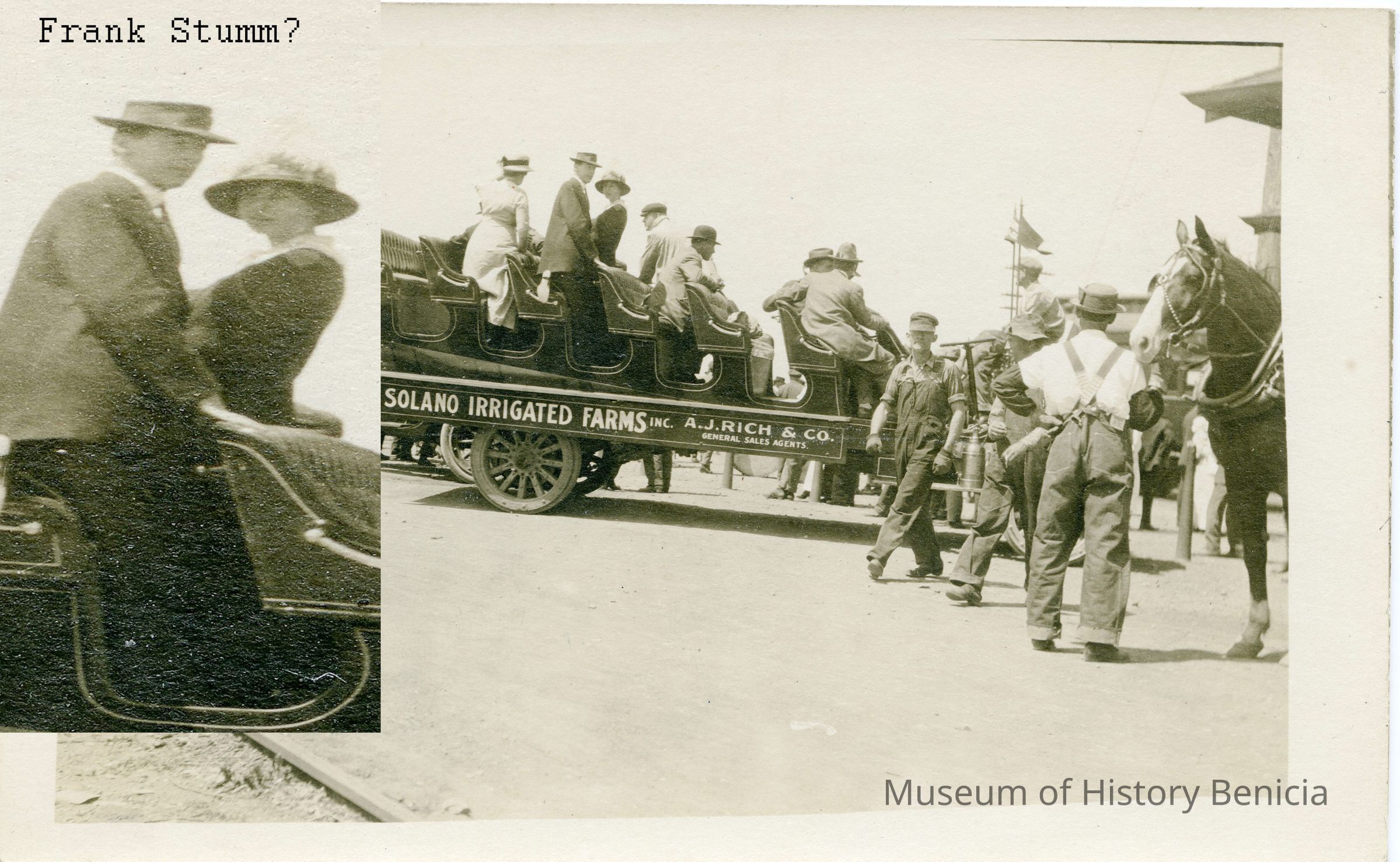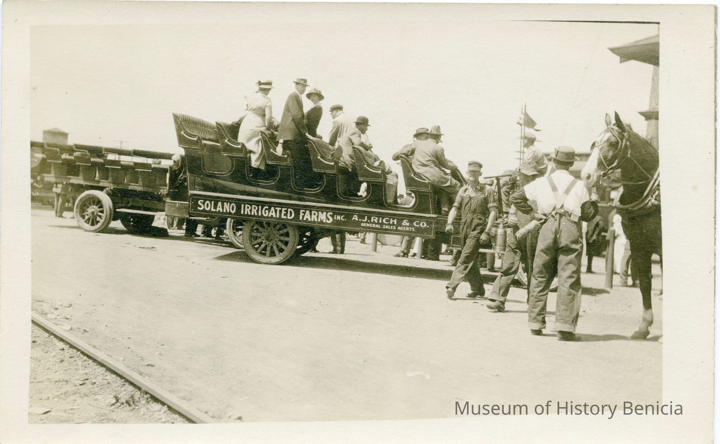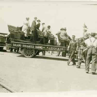 This is a divided back postcard of people on a Solano Irrigated Farms wagon. . The card has a white space on the bottom. The publisher is not shown and the card looks home made. The back is blank.Collection