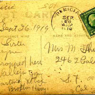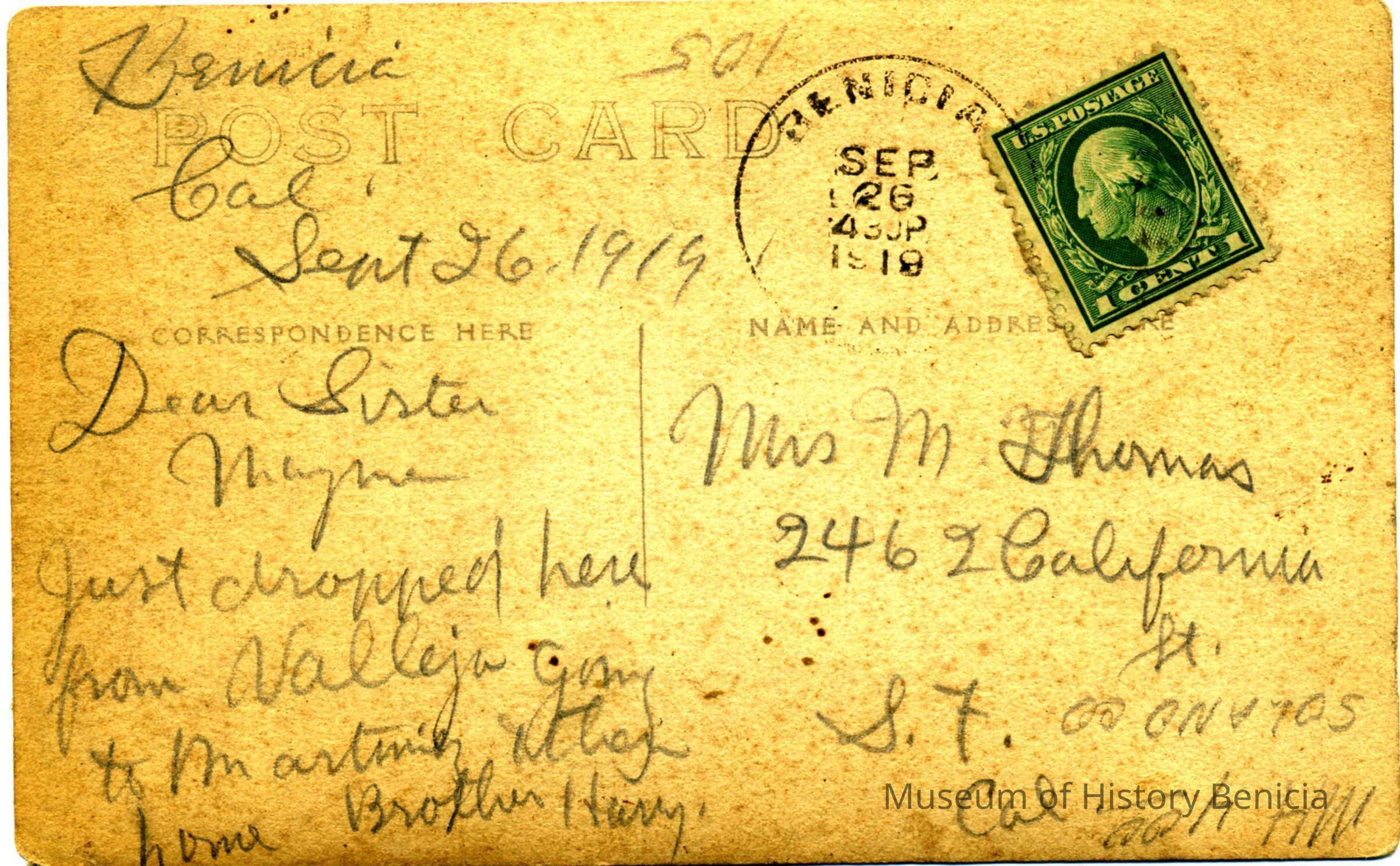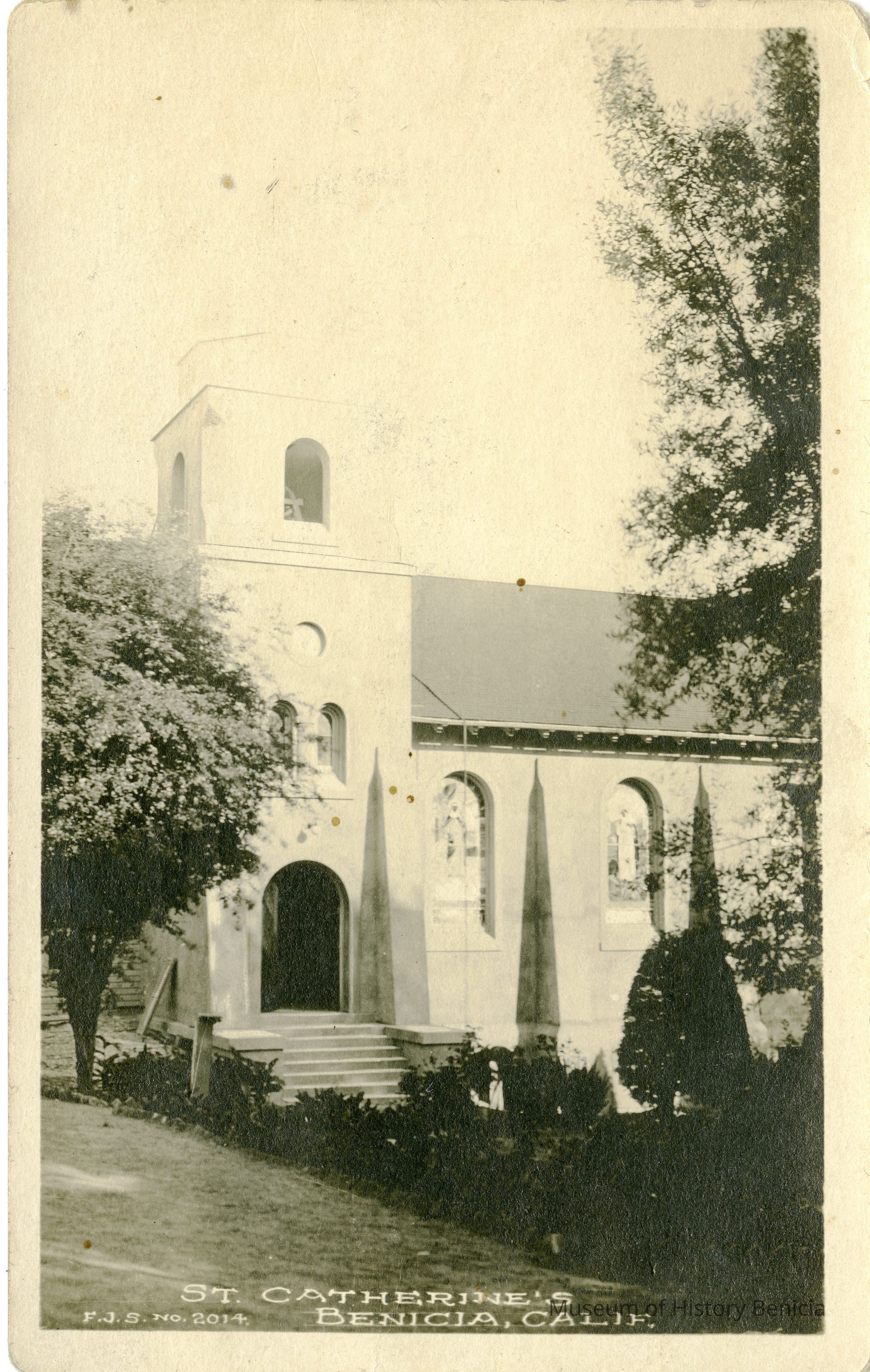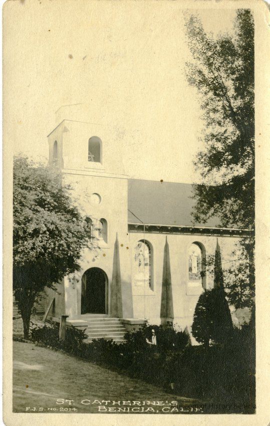 This is a divided back postcard. The photo is of St. Catherine's in Benicia. The card was published by Frank J. Stumm of Benicia, CA. The back is addressed to Mrs. M. Thomas of San Francisco, CA. The card is from her brother telling his sister his travel plans, Vallejo, Benicia, Martinez then home.Collection