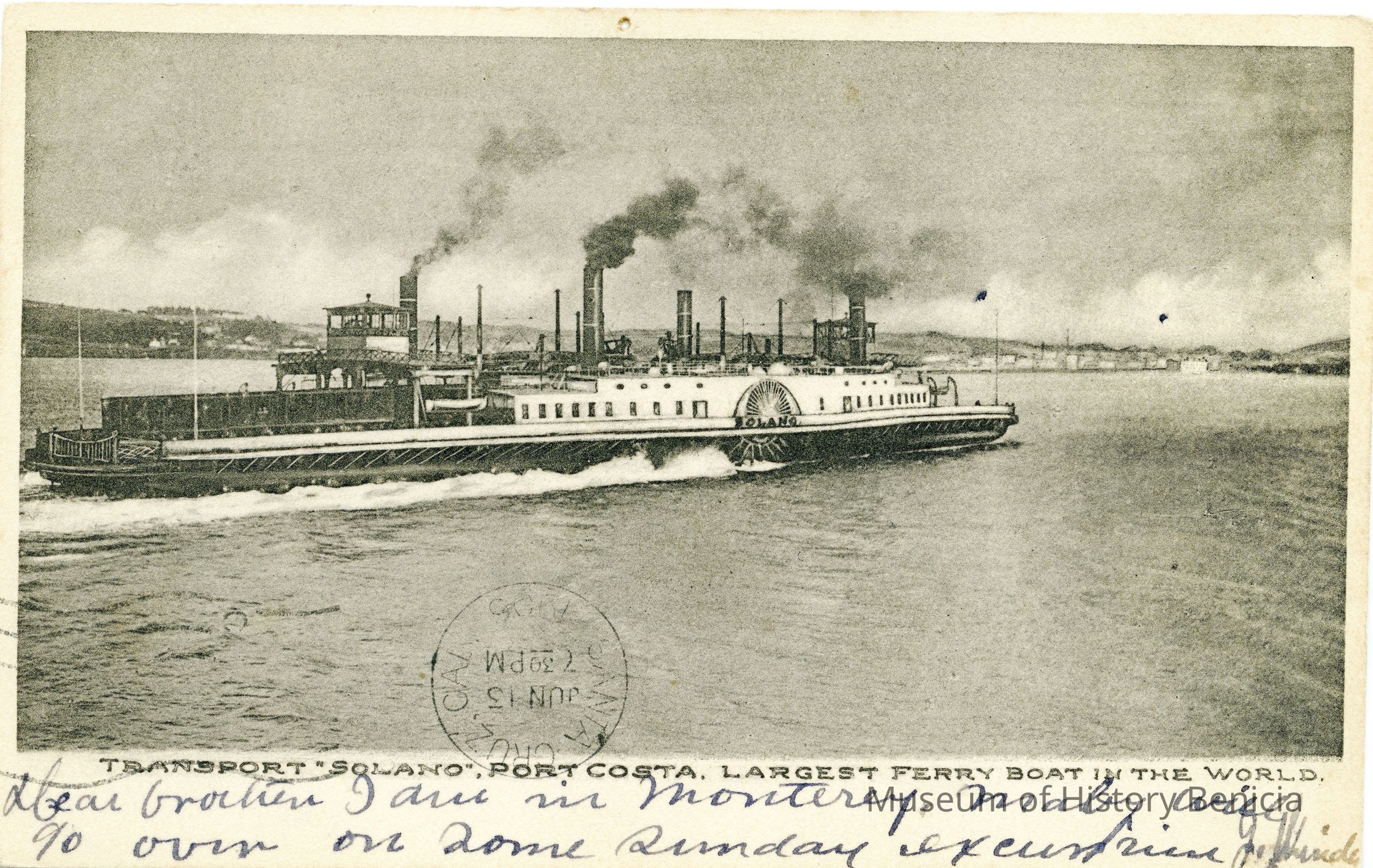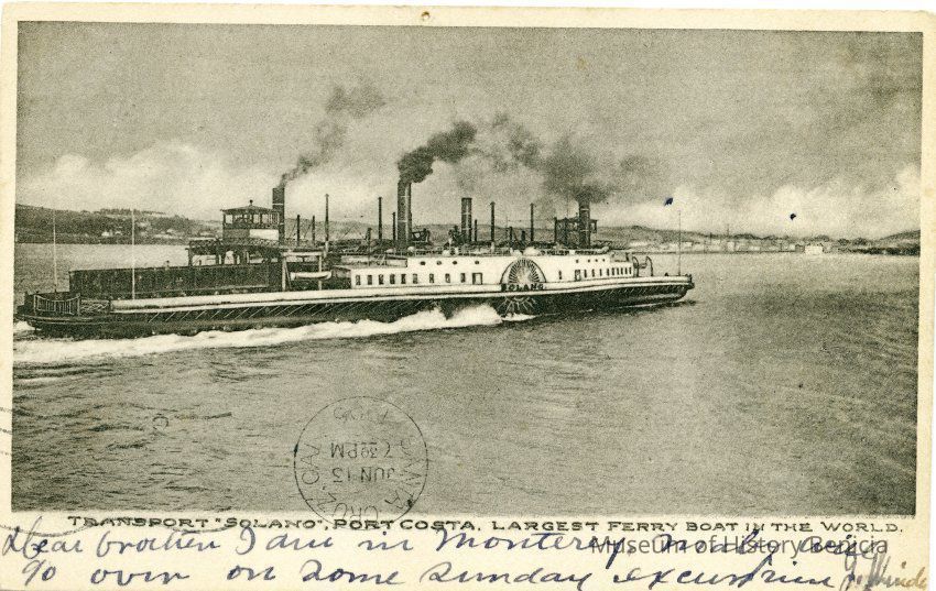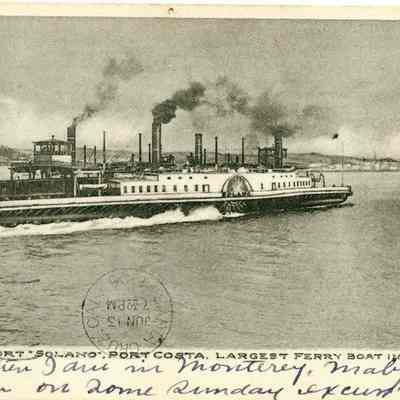 This is an undivided back postcard of the ferryboat "Solano, Port Costa" Largest Ferryboat in the World. The card has a white space on the bottom. The publisher is unknown.