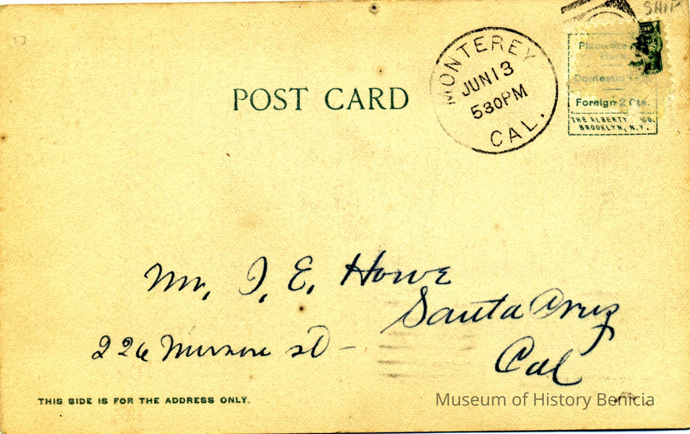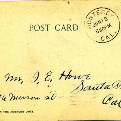 The card is addressed to Mr. J.E. Howe in Santa Cruz, CA. It is just telling that the writter is in Monterey and may go on a Sunday excursion.Collection