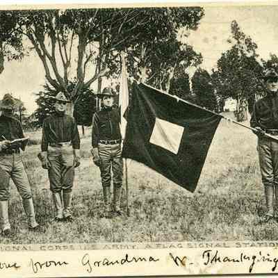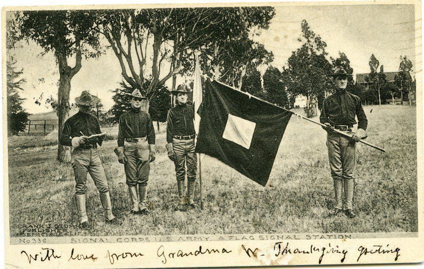 This is an undivided back postcard of the Army Signal Corps. It was published by Frank J. Stumm of Benicia. The back is addressed to Master Howard Turner of Tonapah, Nevada. The message just says "With love from Grandma Thanksgiving greeting".Collection