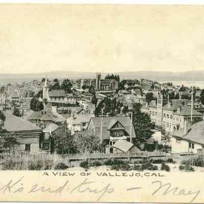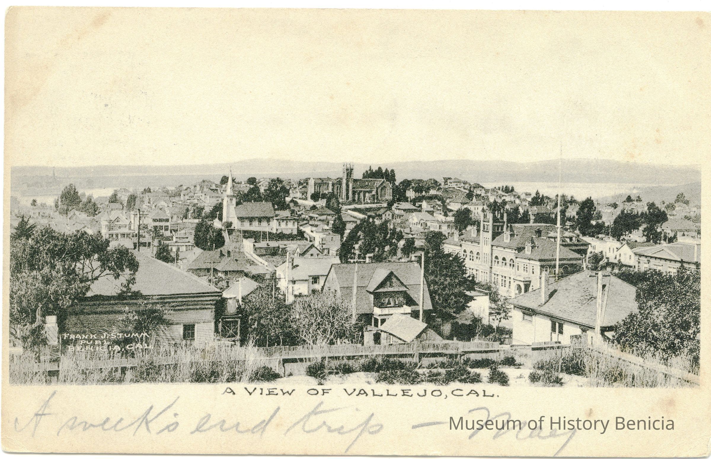 This is a address only back postcard of a birdseye view of Vallejo.. It is marked Frank J Stumm Publisher Benicia, CA. It is a picture of the city from a hill looking towards the Napa River.
