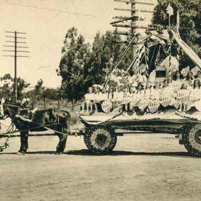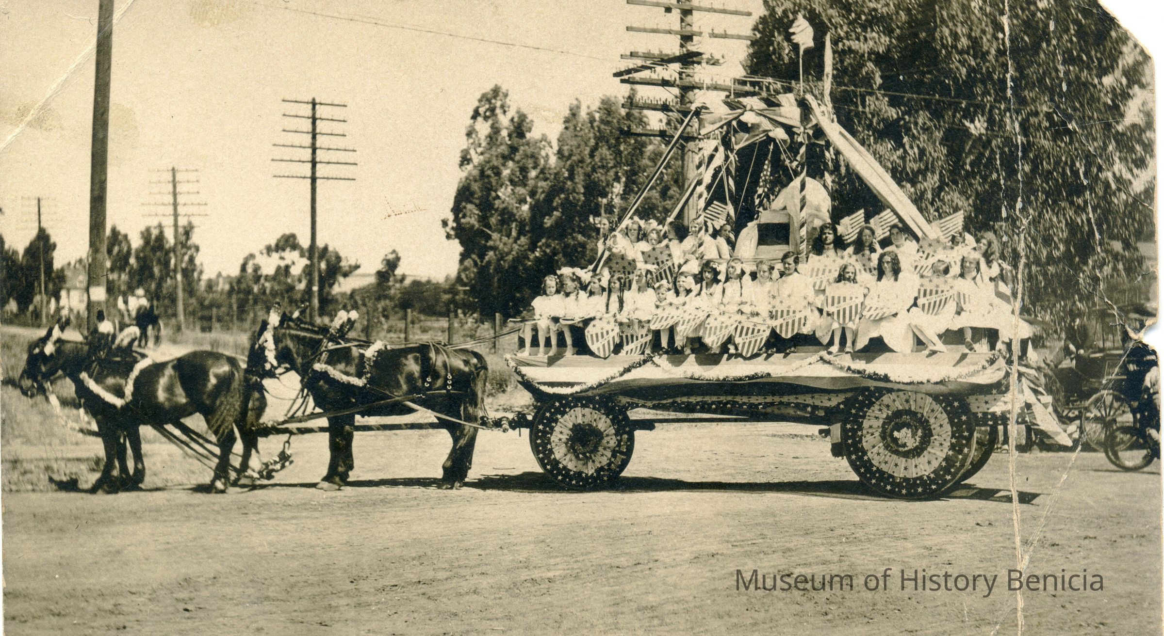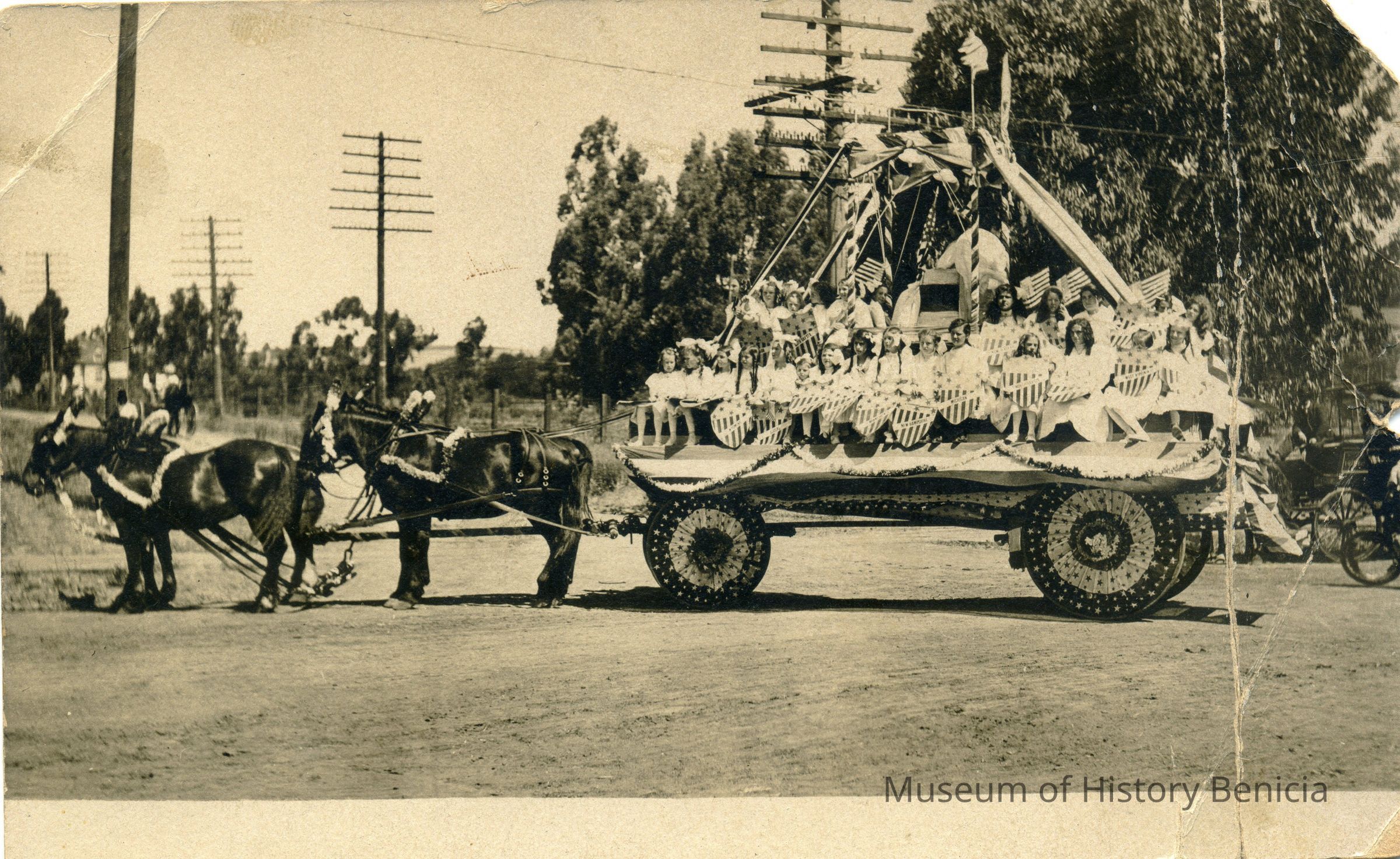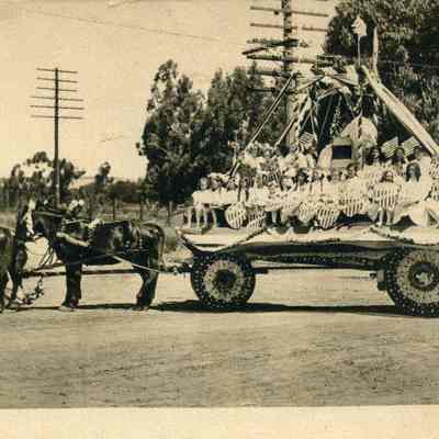 This is a real photo divided back postcard of a horse drawn float in an early Benicia parade. There are many young girls on the wagon carrying patriotic shields. The card is unused.Collection