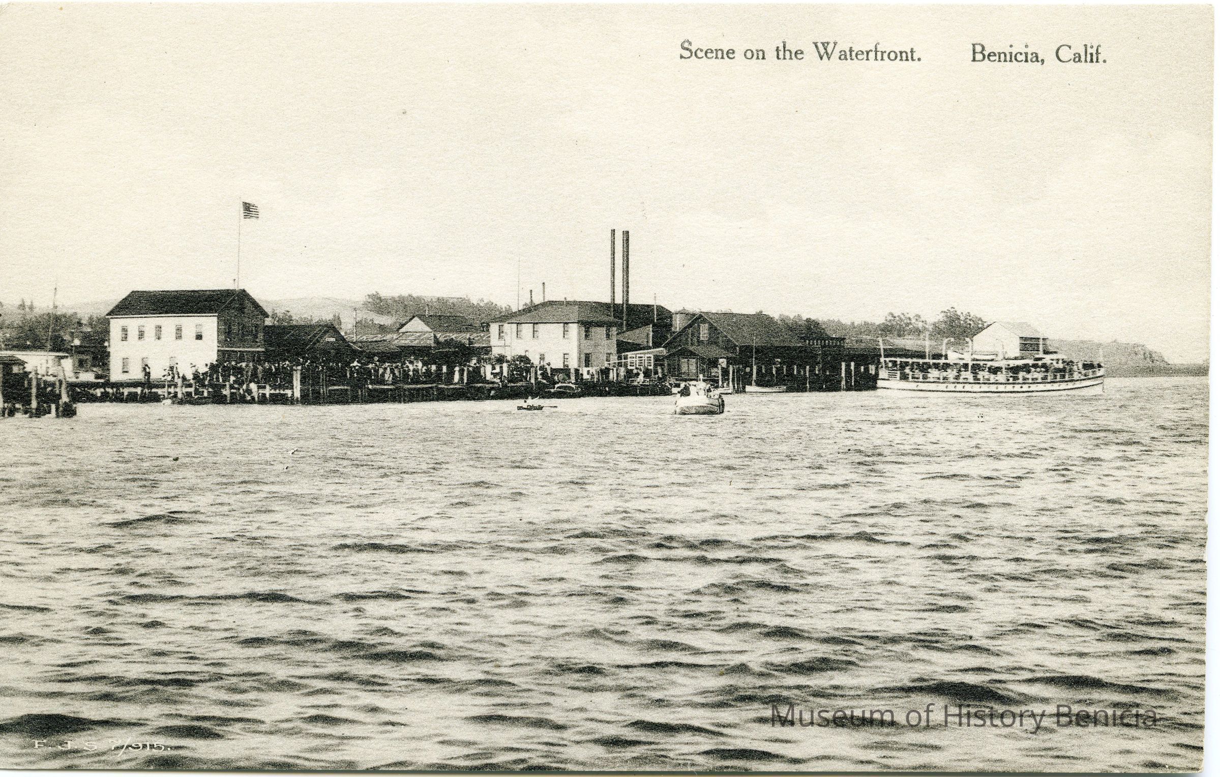 This is a divided back postcard. The photo is of the Benicia waterfront with a passenger boat landing. It was published by Frank J. Stumm of Benicia. The back is blank.Collection