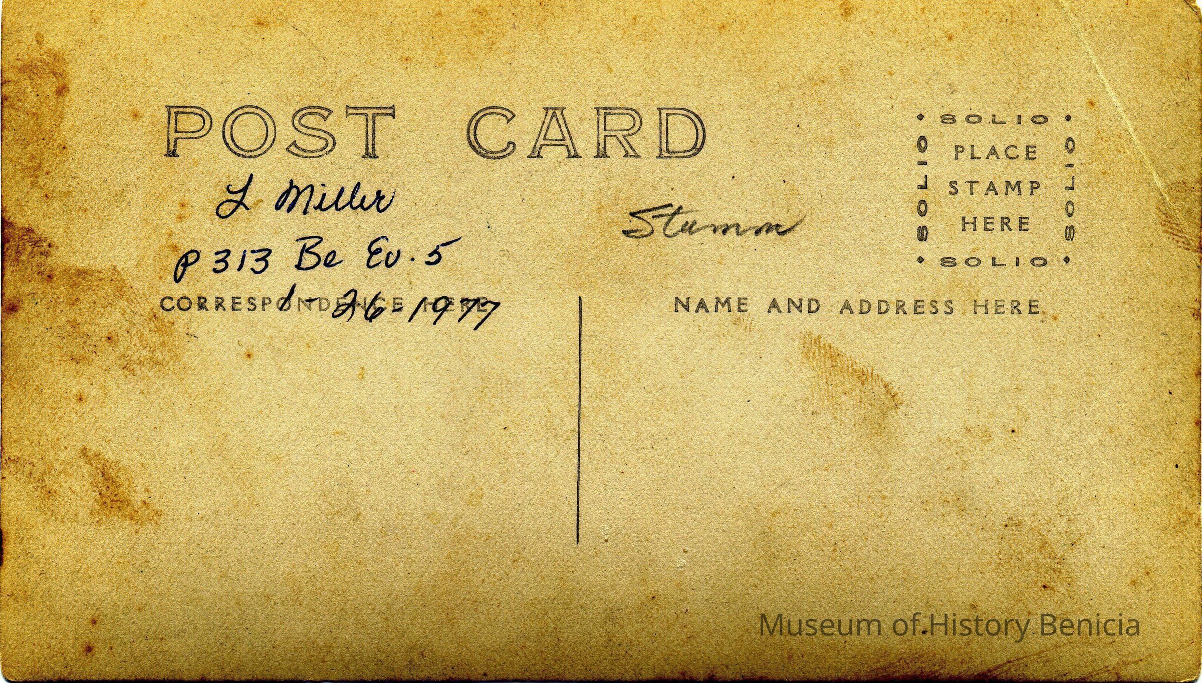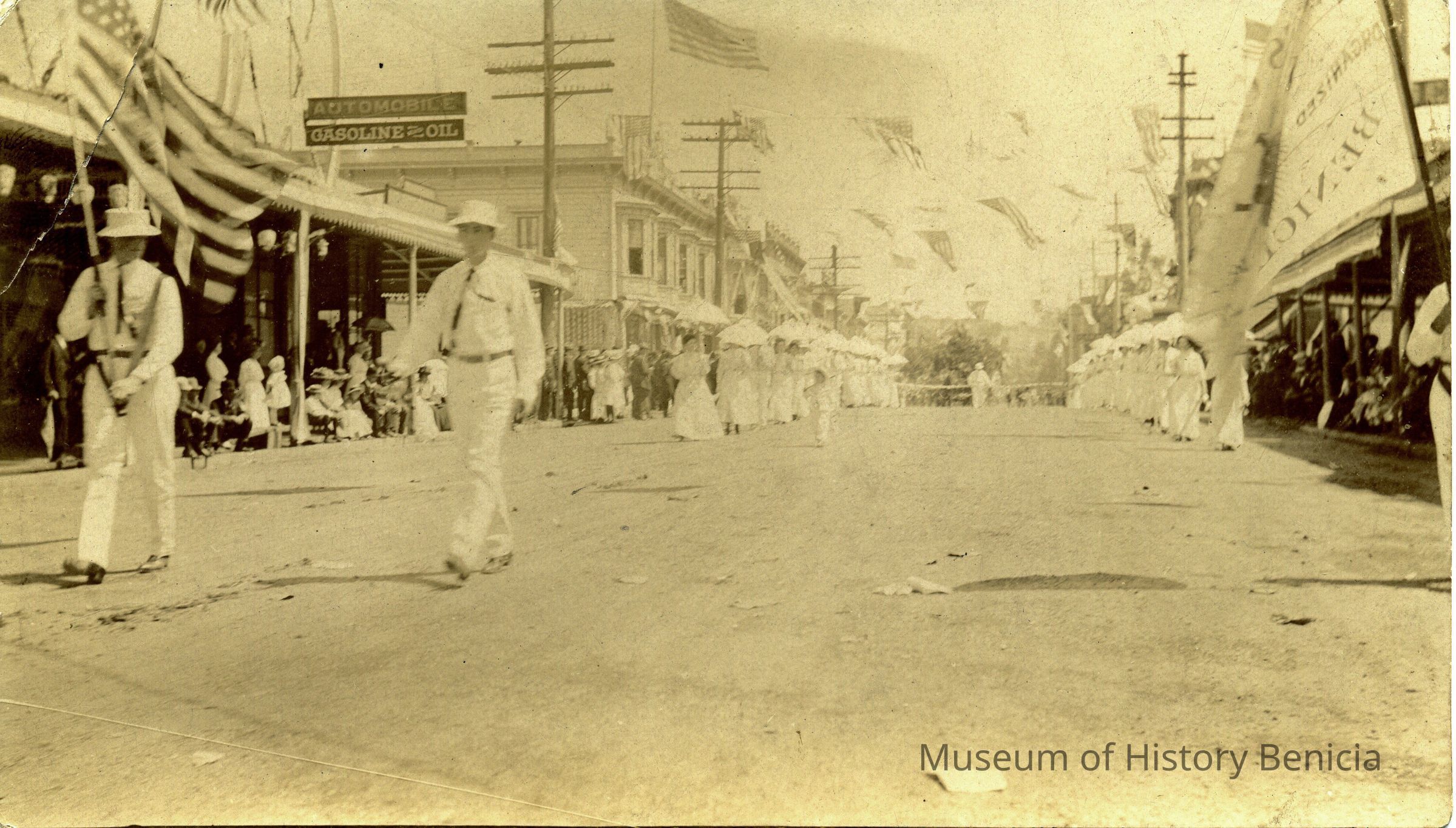Postcard of a parade on First Street Benicia. Shows a flag bearer and two lines of women dressed in white. The back indicates that this photo was taken by Frank Stumm.Collection