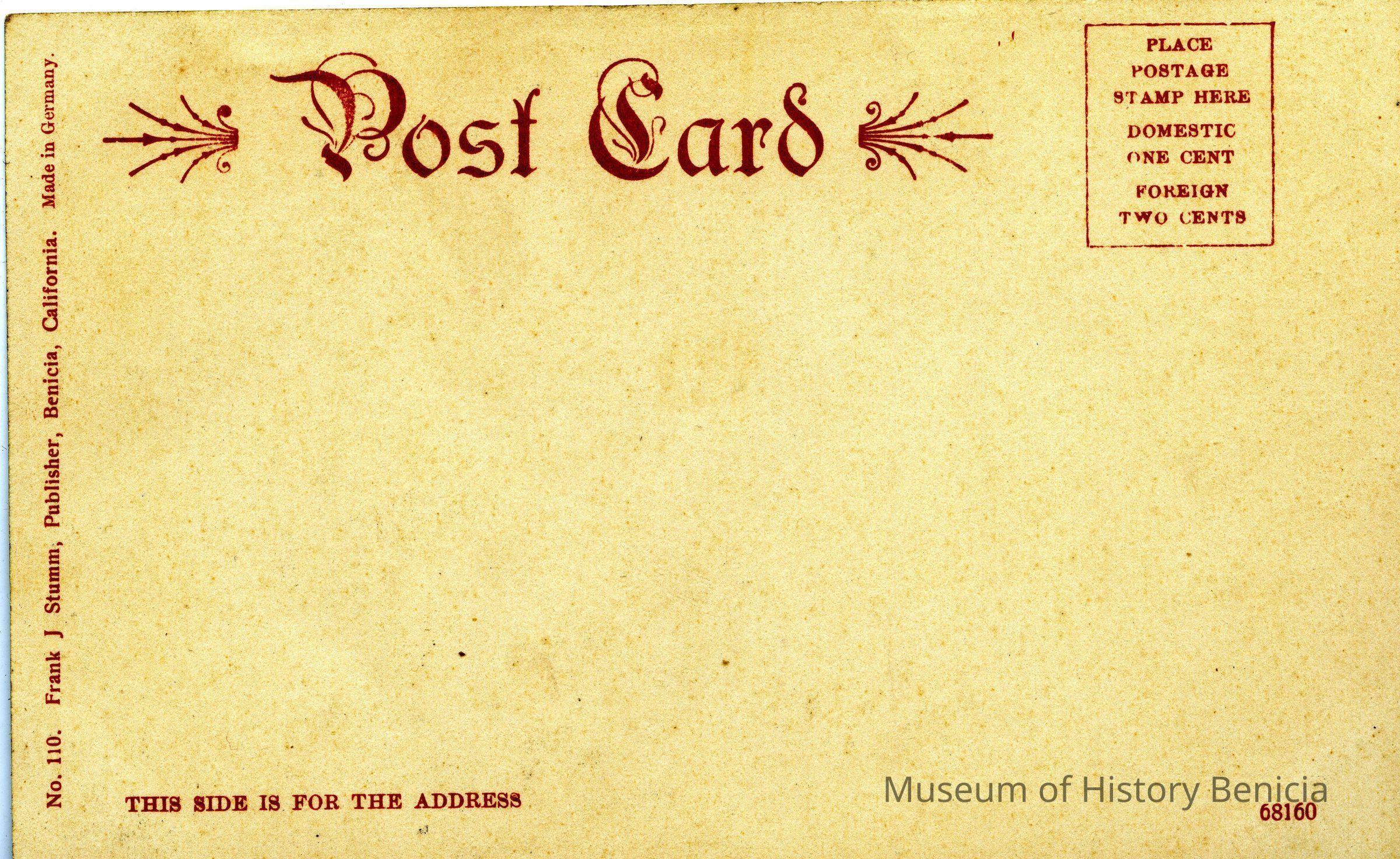 This is a address only back postcard of the "Episcopal Church" in Vallejo. It is colored and was published by Frank J. Stumm Publisher Benicia, Cal No 110. There is a photo on the front of the Methodist Episcopal Church that was on Virginia St. in Vallejo and nearby buildings.Collection