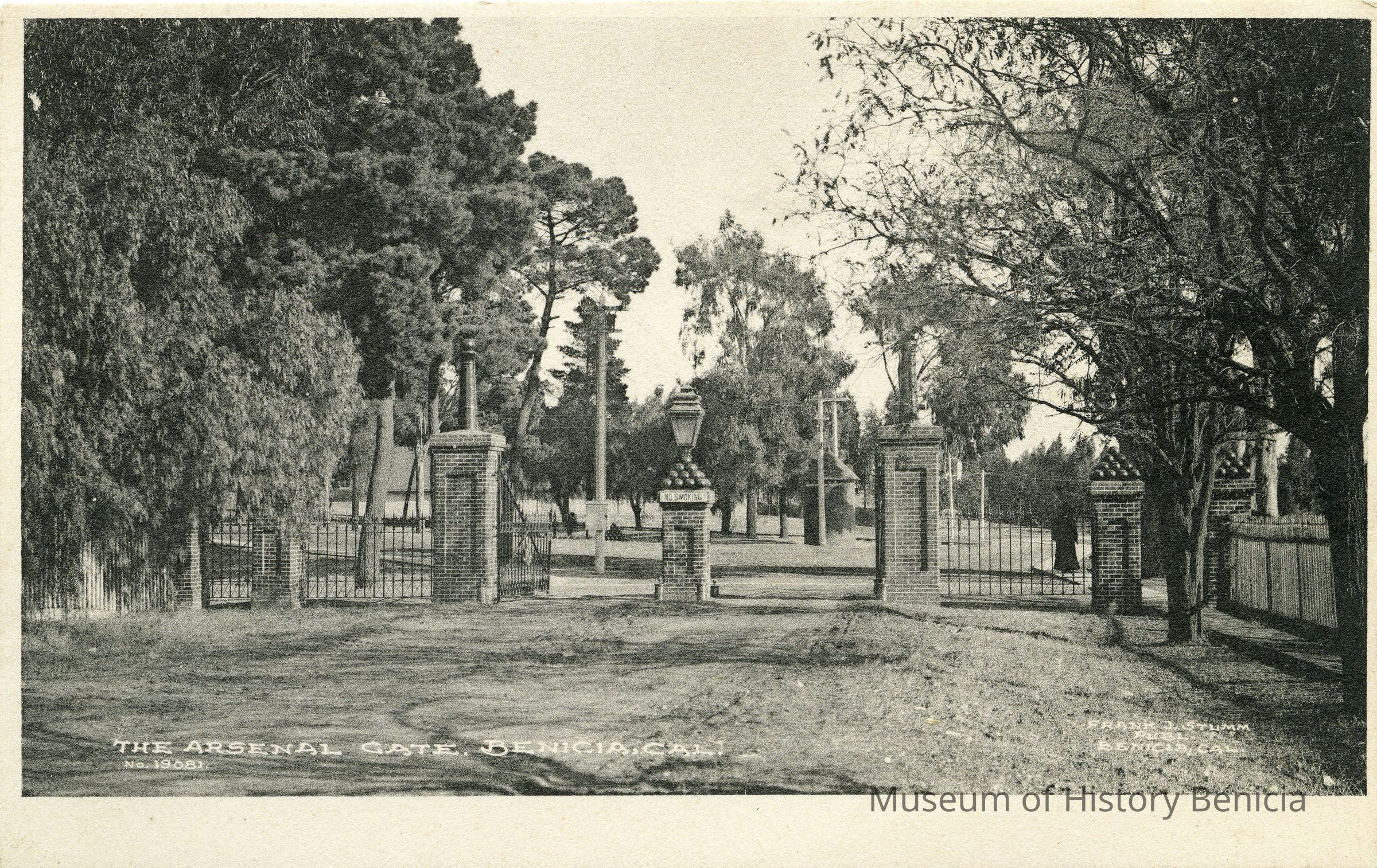 This is a divided back postcard of the Main Gate at the Benicia Arsenal No 19081. It is by Frank J. Stumm Publisher Benicia, Cal. The card is black & white and shows awrought iron gate with brick posts. Some are topped with cannon balls. at the Arsenal.