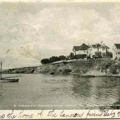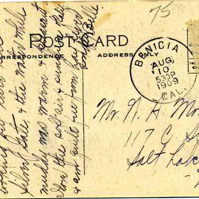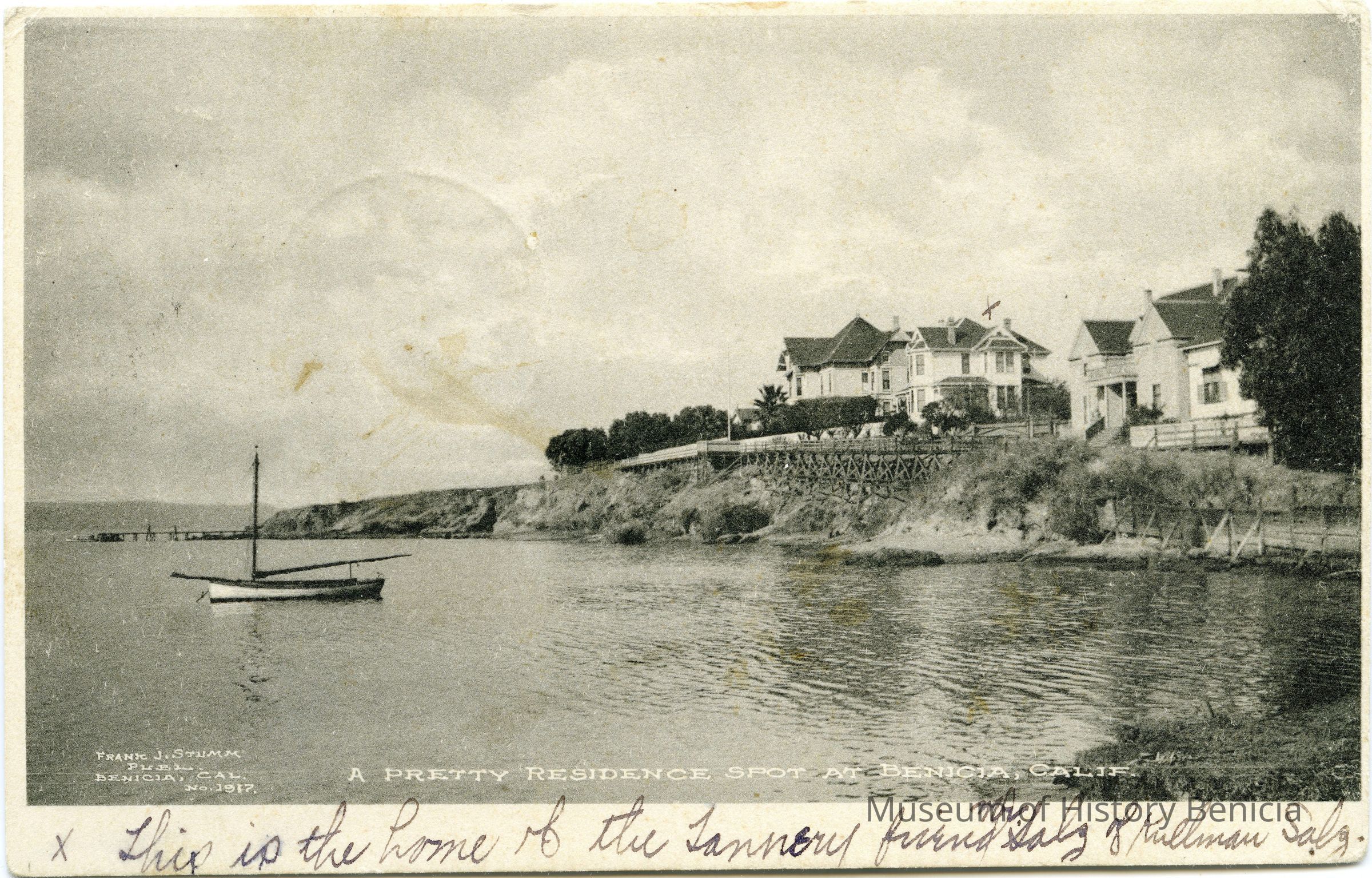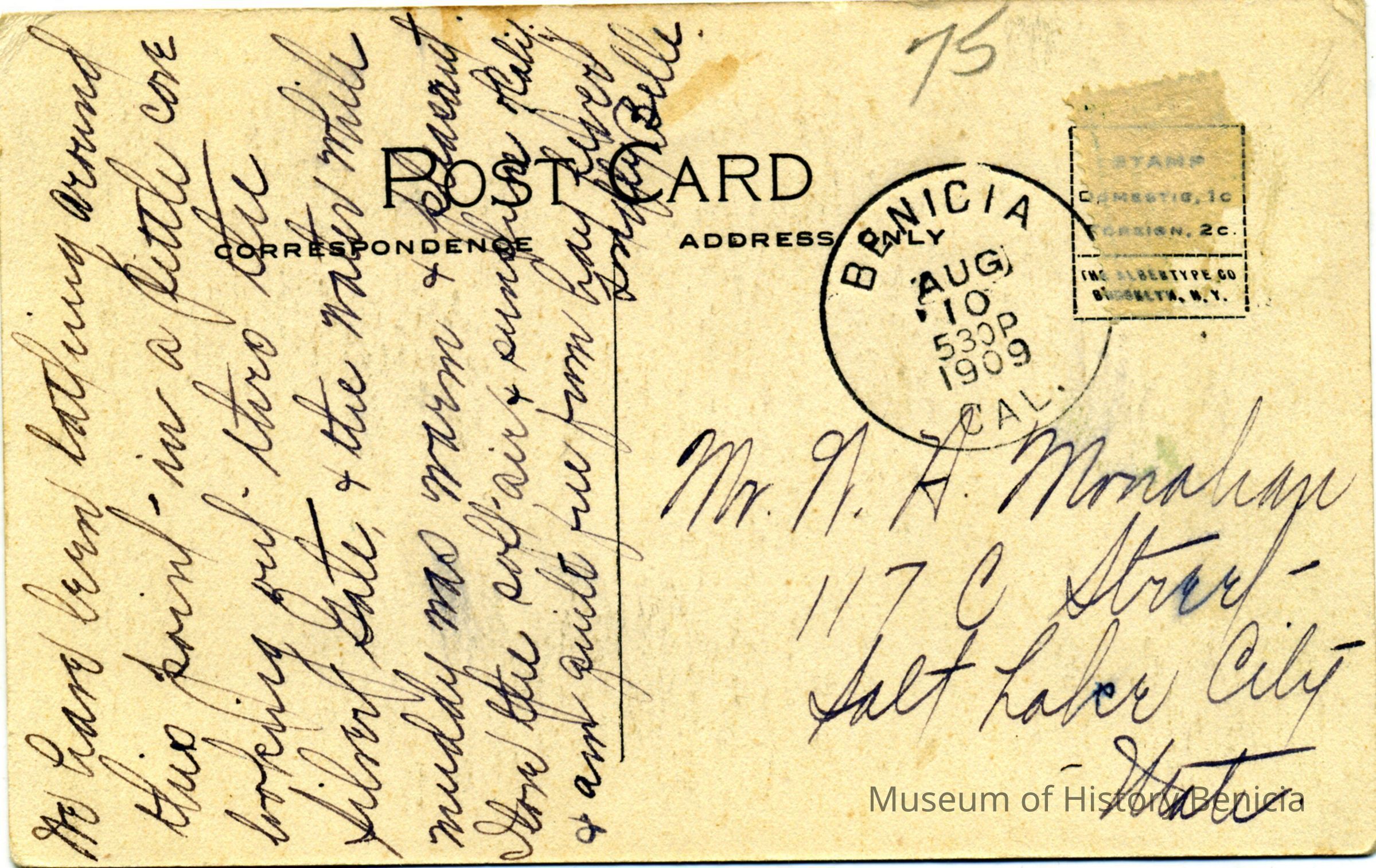 This is a divided back postcard of the homes in Benicia on the bluff overlooking the Carquinez Straits. It was published by Frank J. Stumm of Benicia. The back is addressed to Mr. W.A. Monahan in Salt Lake City, UT. Message is about the houses and one owned by Mr. Salz and floating around looking at the Silver Gate.Collection