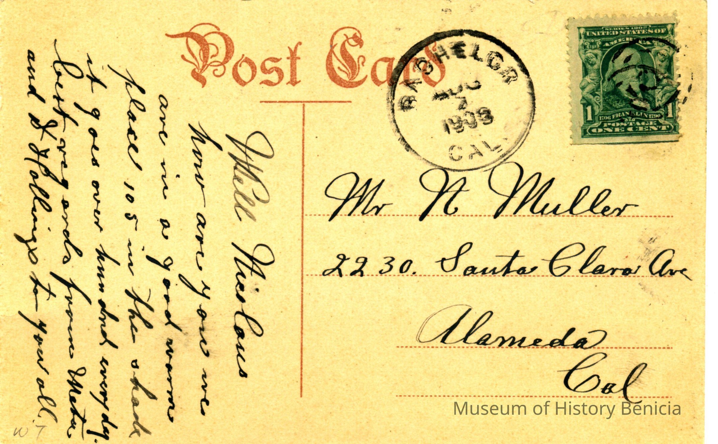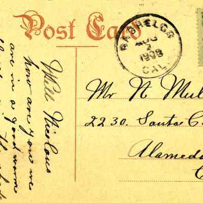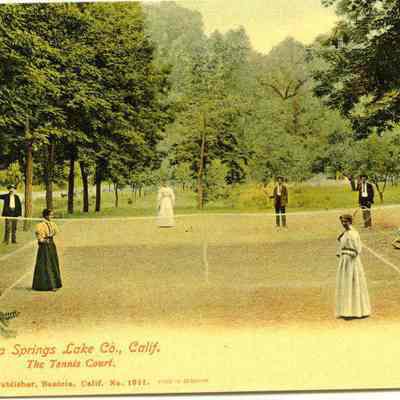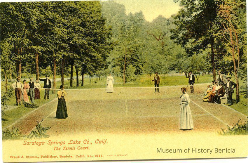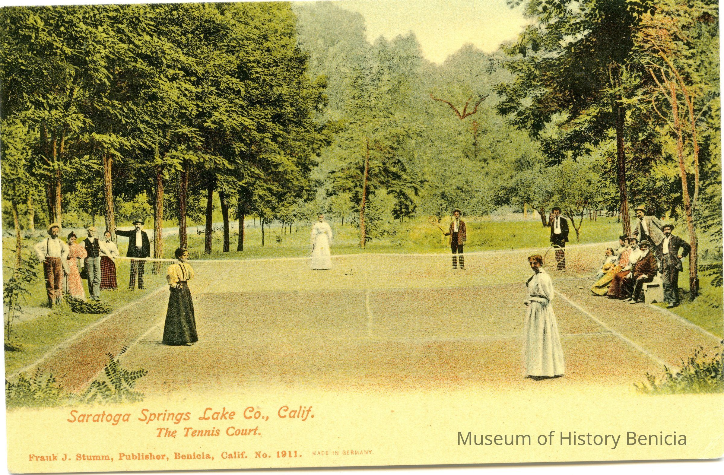 This is a divided back postcard of the tennis courts at Saratoga Springs resort in Lake County, CA. It was published by Frank J. Stumm of Benicia. The back is addressed to Mr. N Miller of Alameda, CA The message talks about the weather and gives their best wishes.Collection
