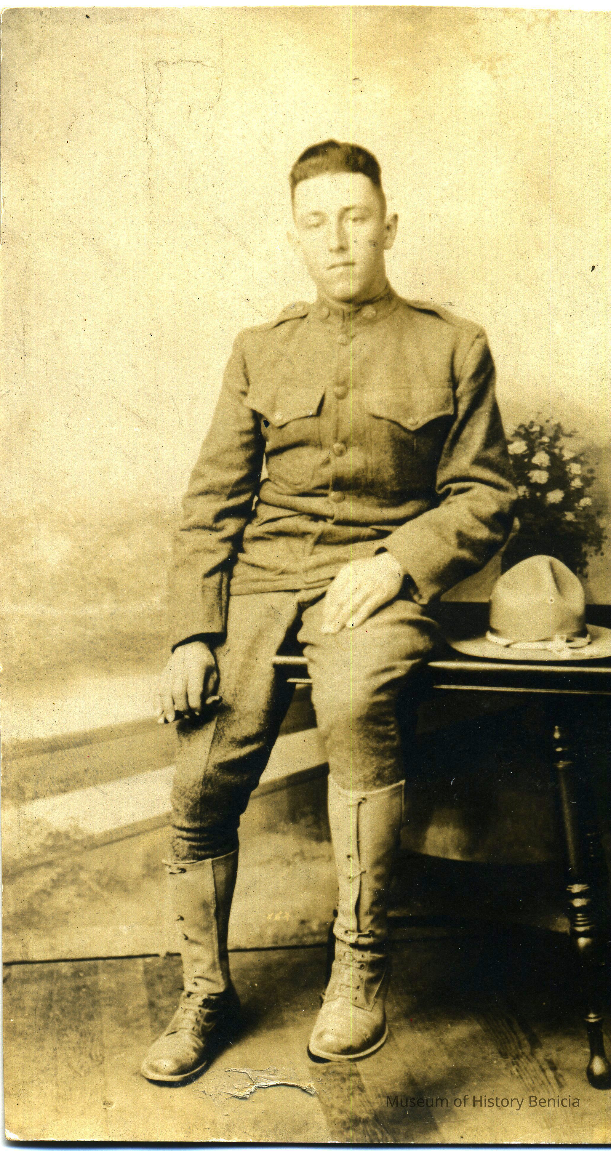 This is a real photo postcard of a WWI soldier. It identifies the soldier as J.E. Furtado Company "B" 159th Infantry at Camp Kearny San Diego.Collection