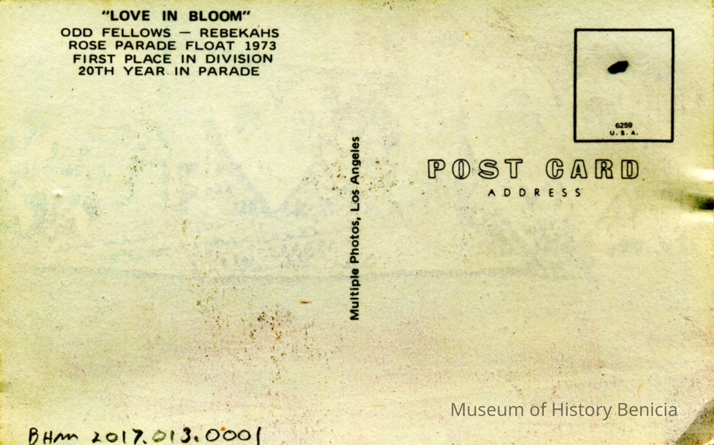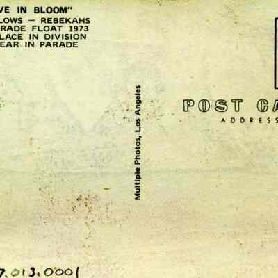 Picture postcard of the Odd Fellows/ Rebekahs float in the 1973 Rose Parade.