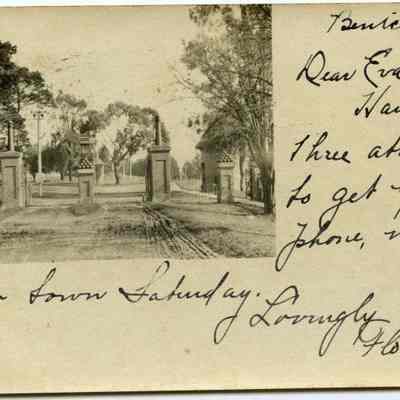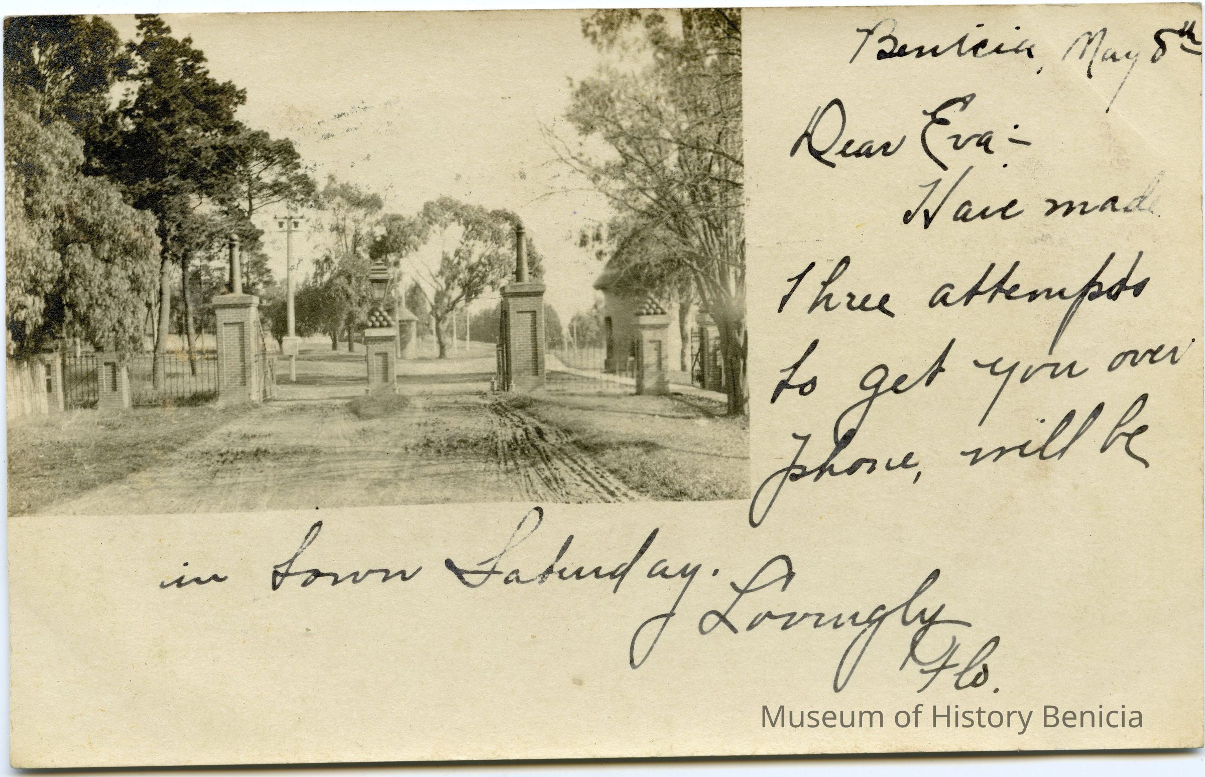 This is an undivided back postcard with white space on the front for the message. The photo is of the Benicia Arsenal gates. It does not show that it was published by Frank J. Stumm of Benicia. The back is addressed to Mrs. J.B. Crowly of San Francisco, CA. The message says that the writter of the card has tried to contact Mrs. Crowley by phone three tiems and will be in town Saturday.Collection