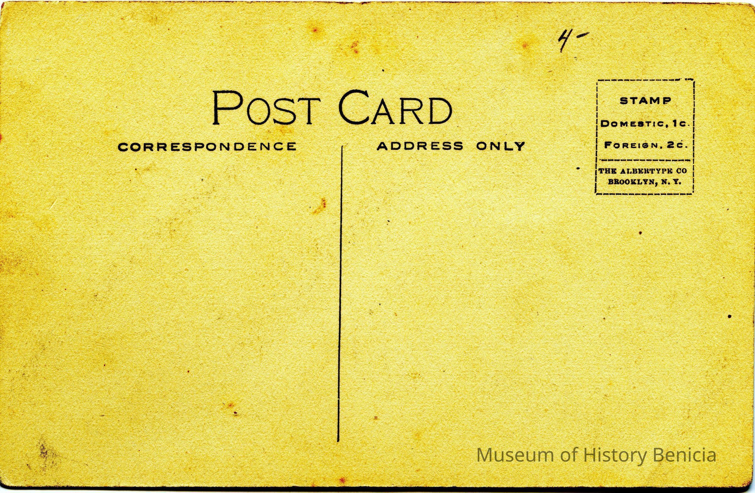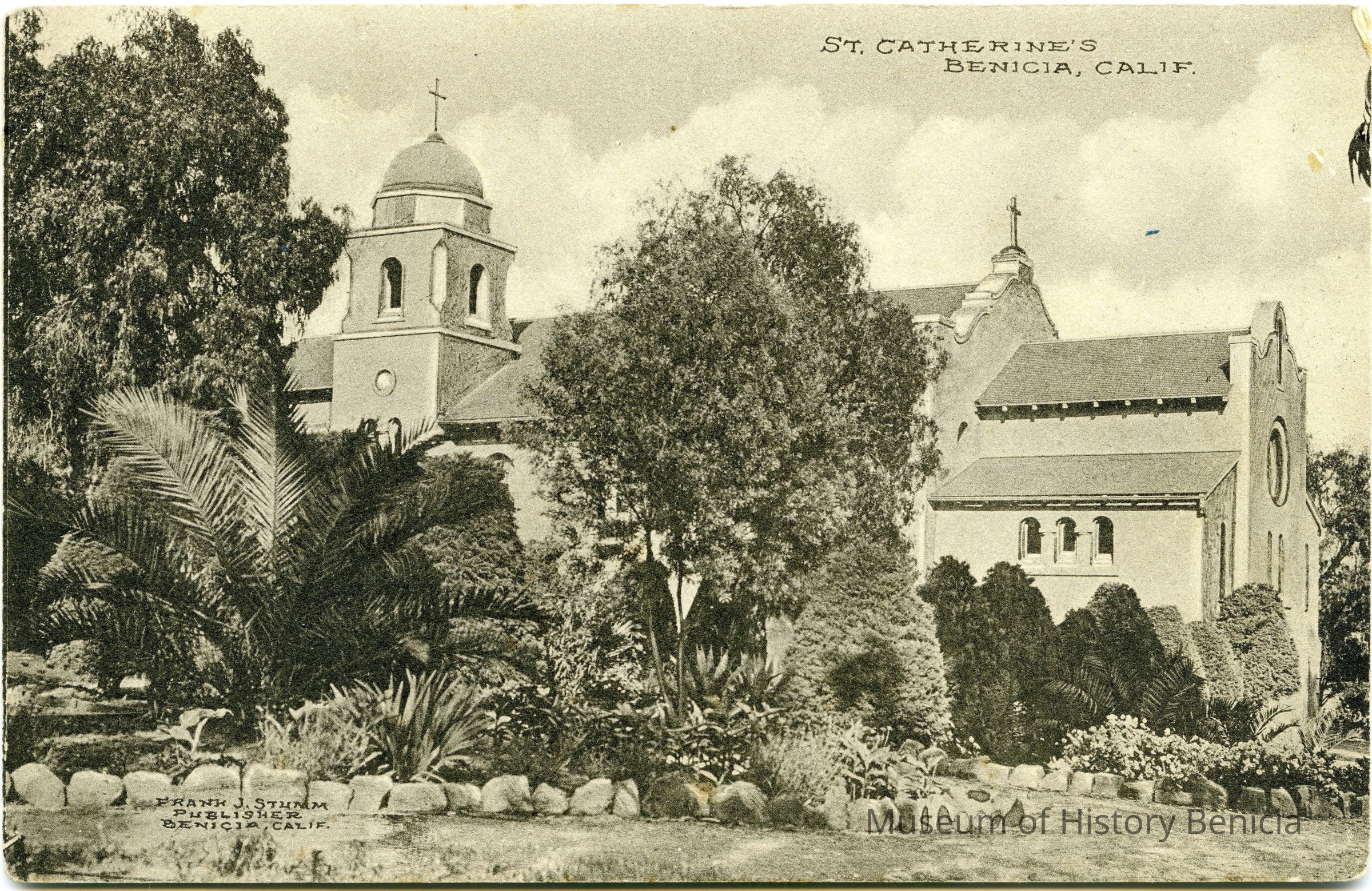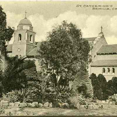 This is a divided back postcard of St. Catherine's in Benicia. It is marked Frank J Stumm Publisher Benicia, CA. It is a picture of the school from in the garden.
