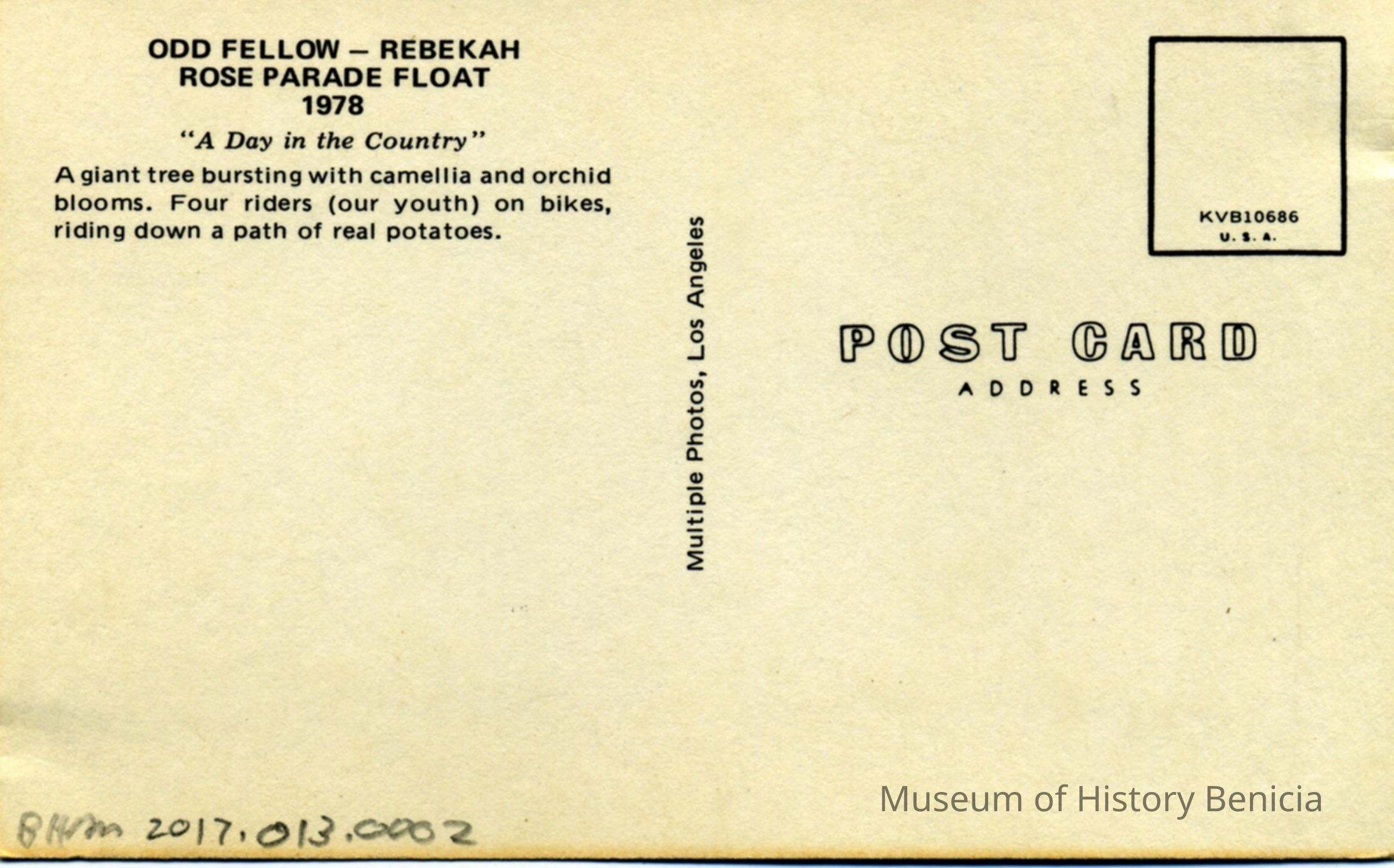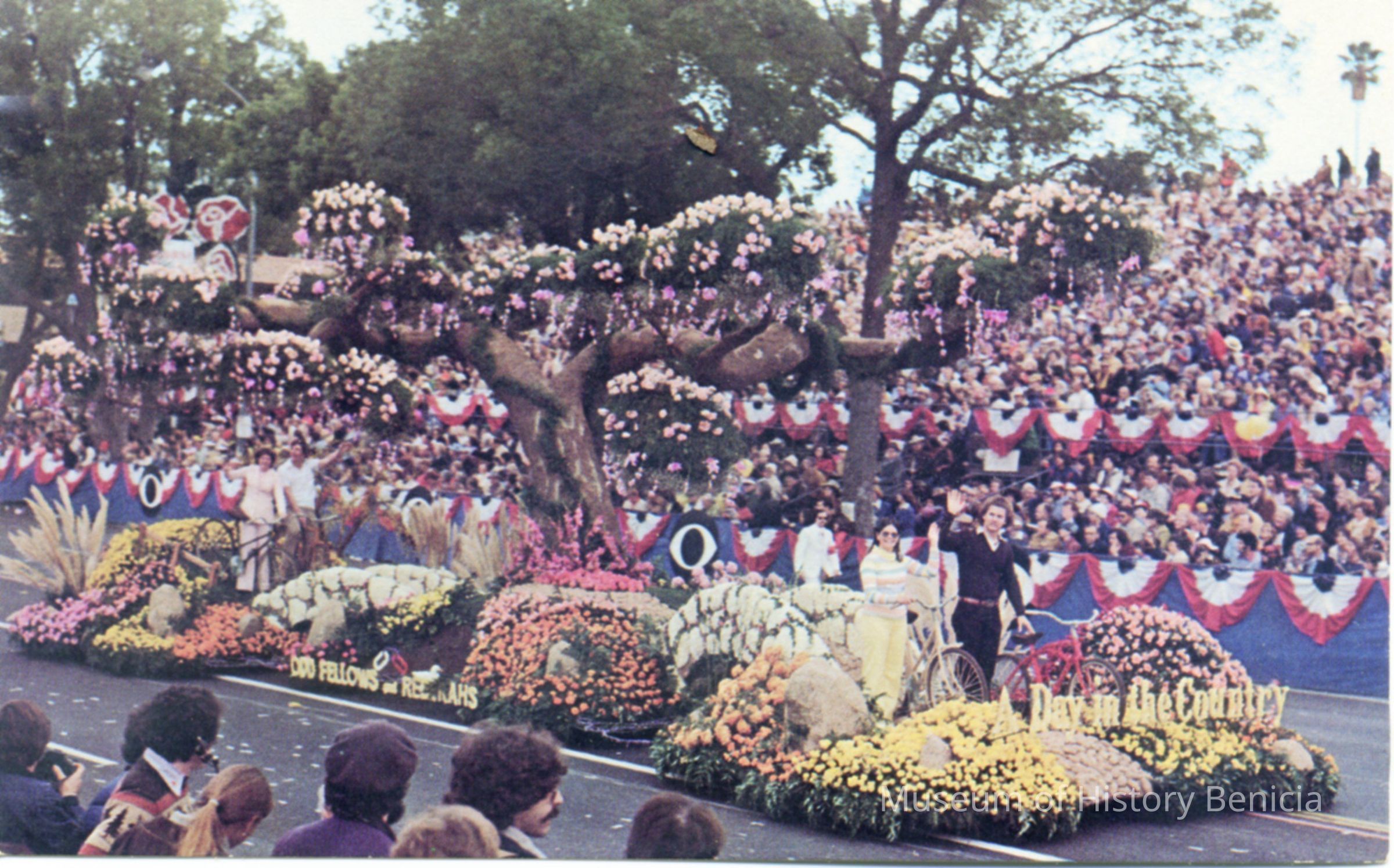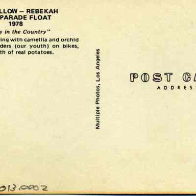 Picture postcard of the Odd Fellows/ Rebekahs float in the 1978 Rose Parade.