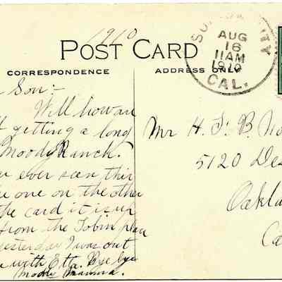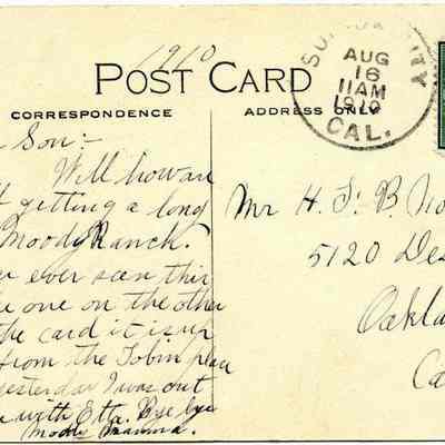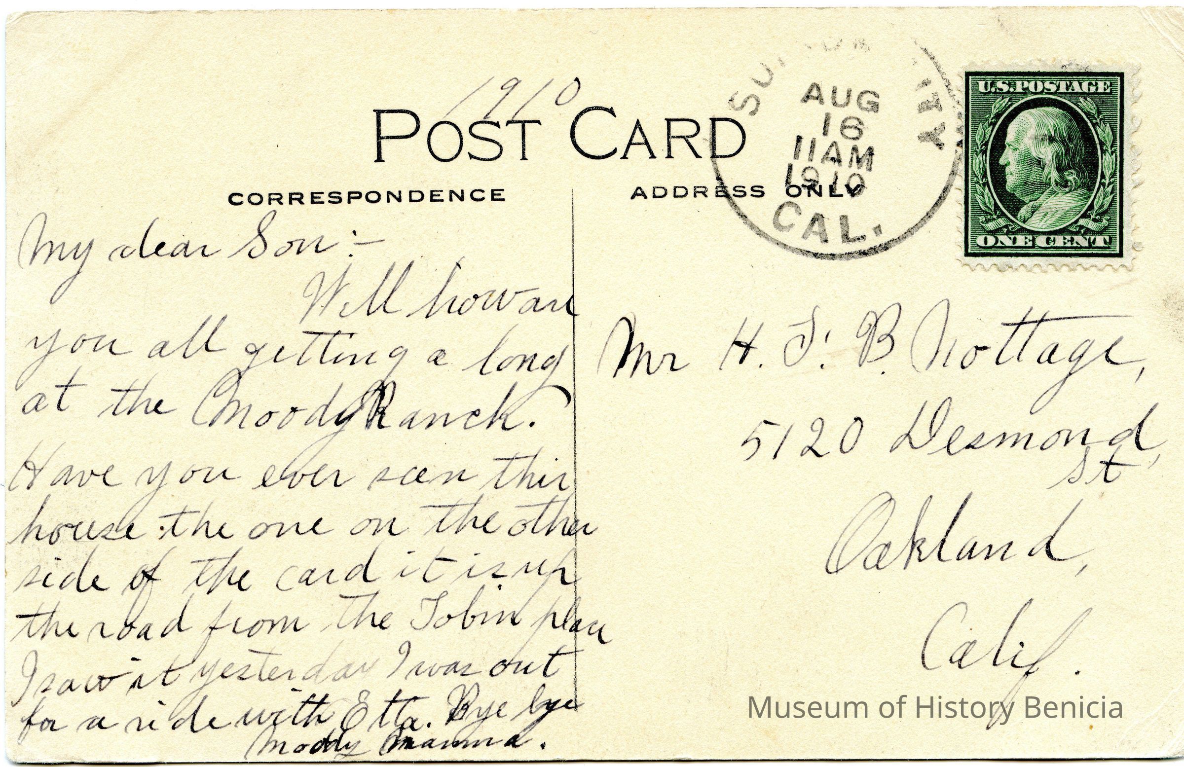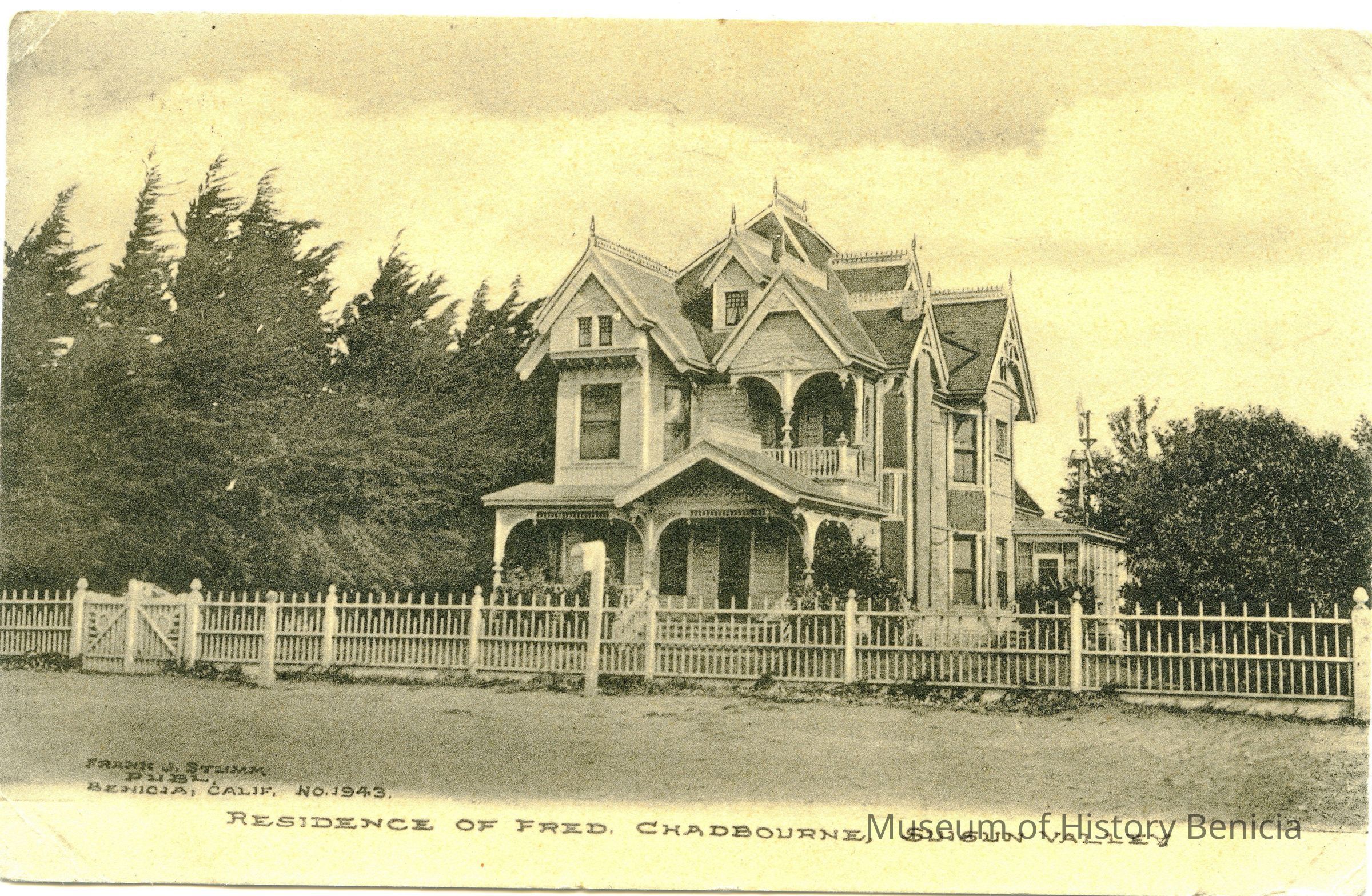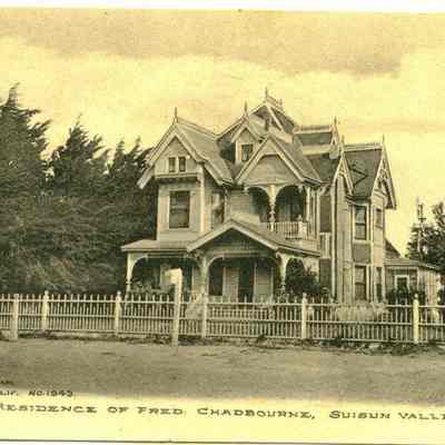 This is a b&w Stumm postcard of the Chadbourne residence in Suisun Valley. It is specifically of the Fred Chadbourne house. The card is written to Miss Florence Adams in Santa Rosa, CA.