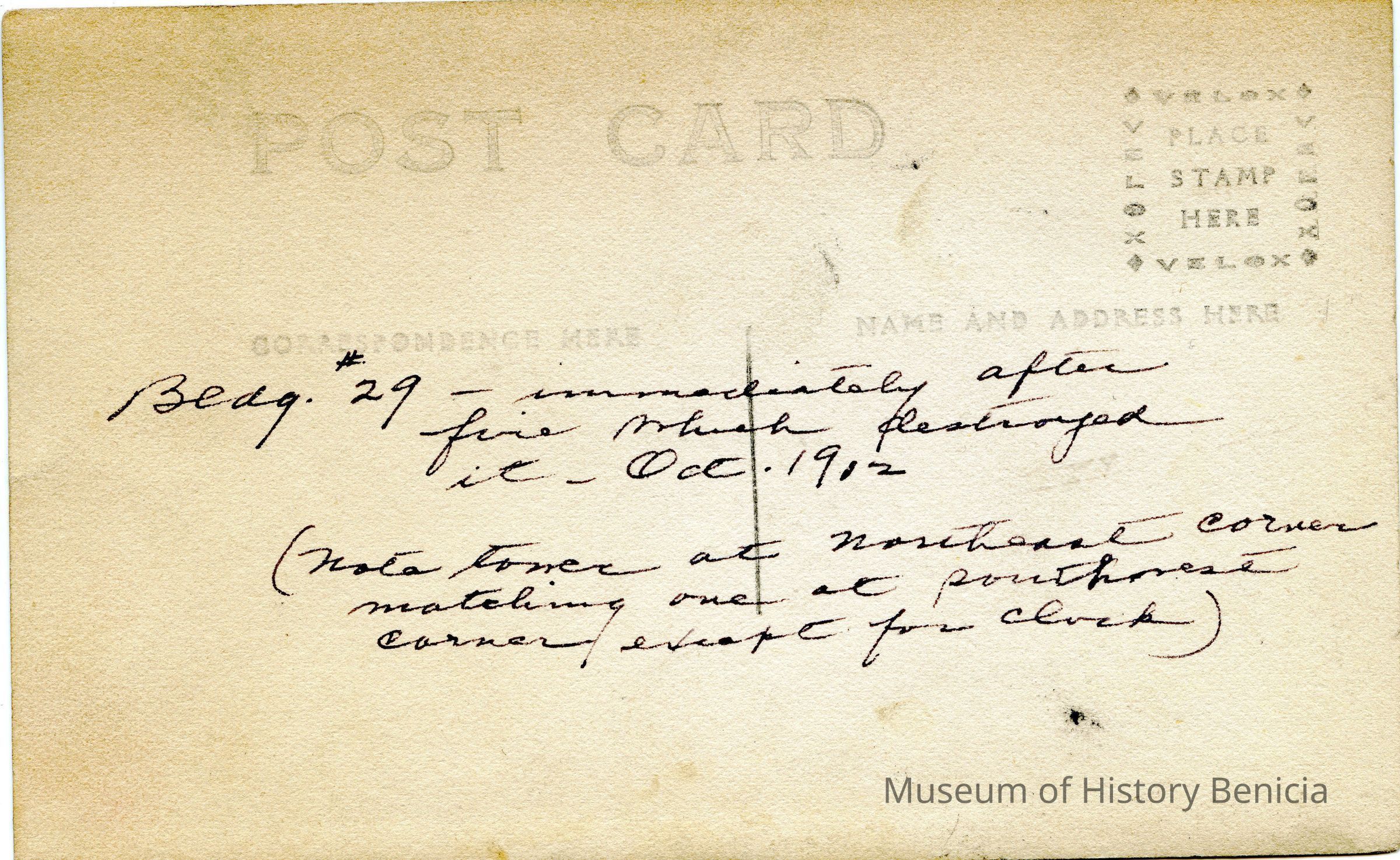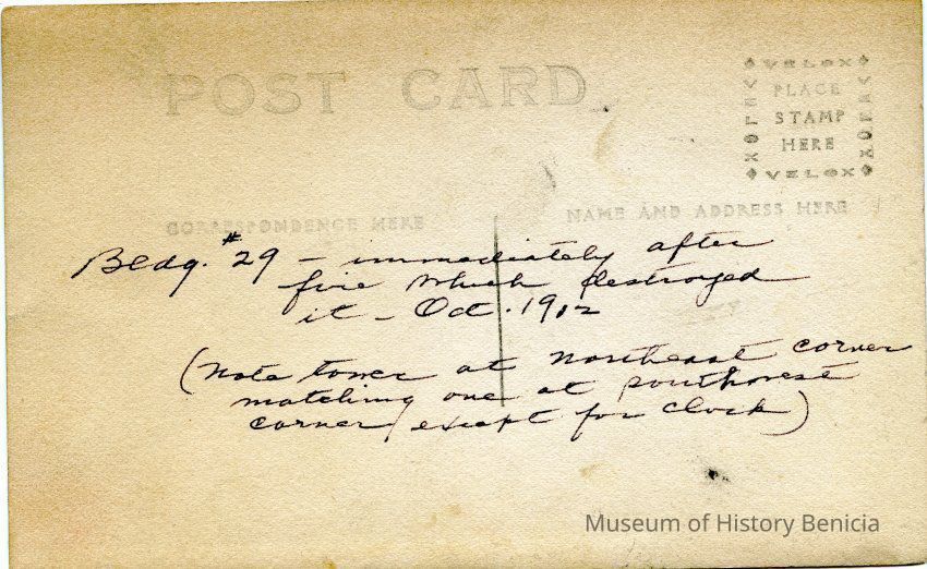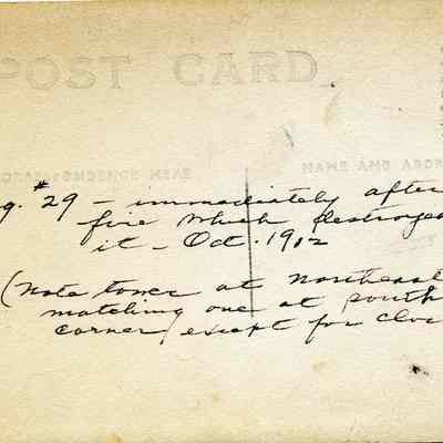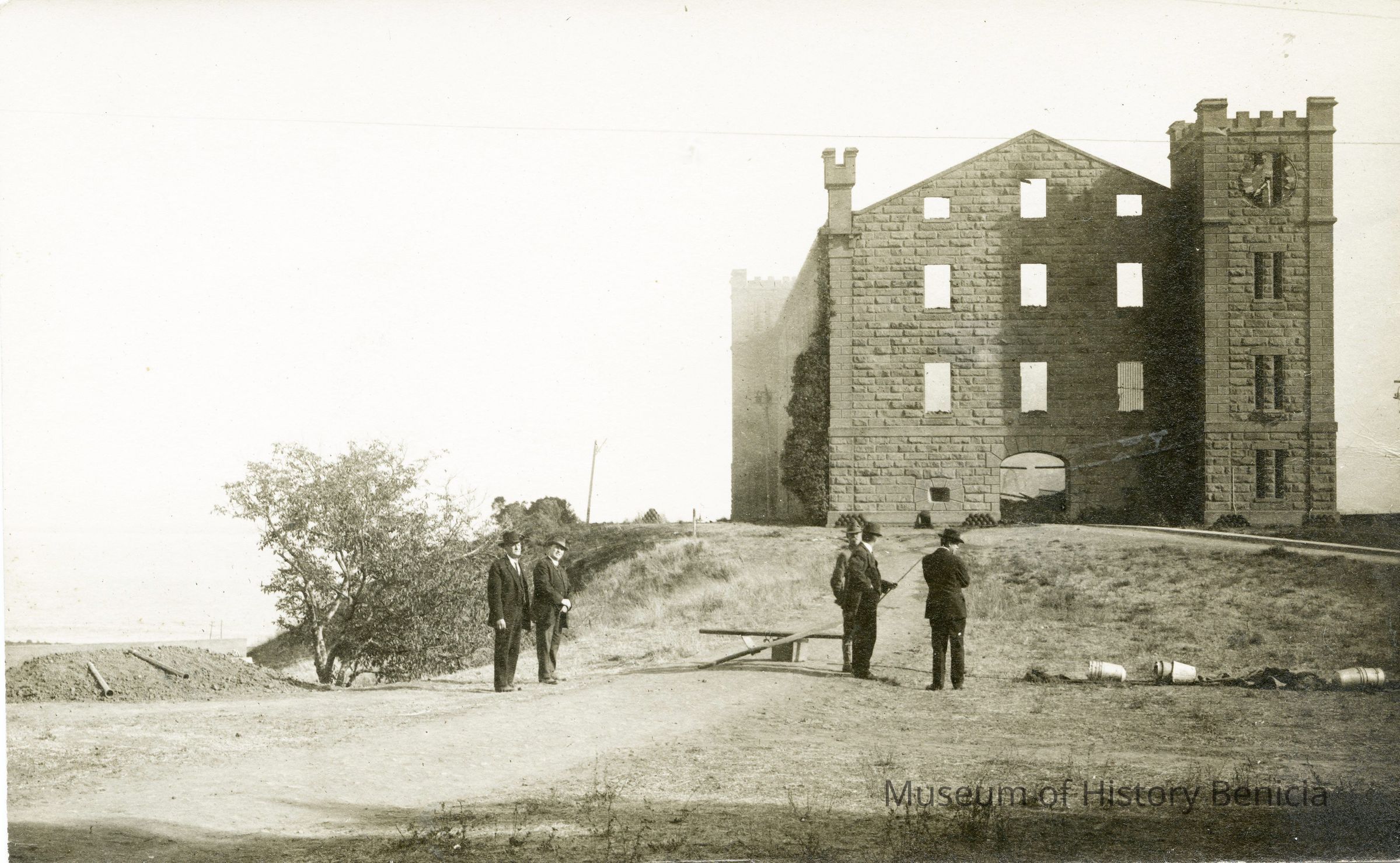 This is a postcard photograph of the Clock Tower (building #29) after the explosion and fire in October, 1912. It shows several men in suits surveying the damage.