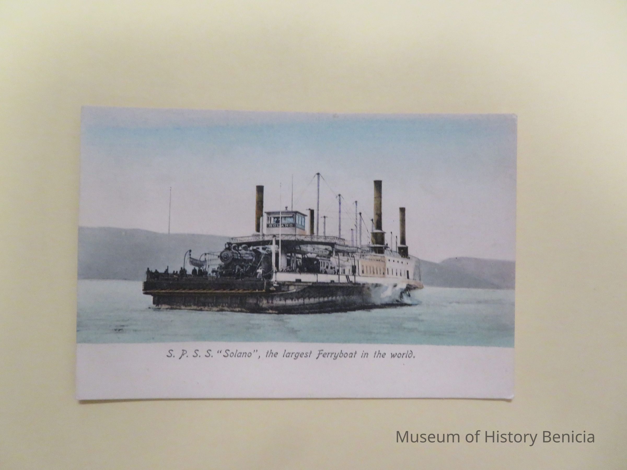 S.P.S.S. "Solano", the largest Ferryboat in the world postcard. On back of card is written "Frank J. Stumm, Publisher, Benicia, California, No. 383, printed in Leipzig, Germany, handcolored work"Collection