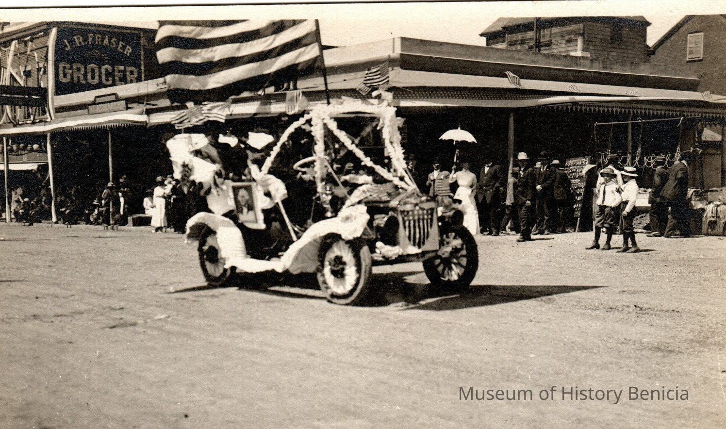Postcard - B/W Photograph of an automobile in the Benicia 4th of July Parade in1911. This care is in the intersection of First and H Streets. The poscard was not sent, only the lettering indicating it is a postcard is on the back.Collection
