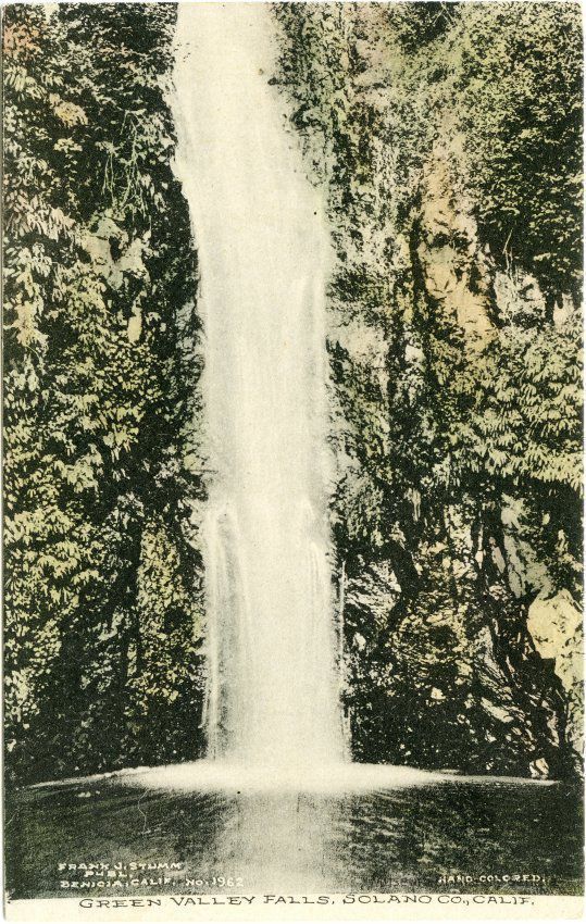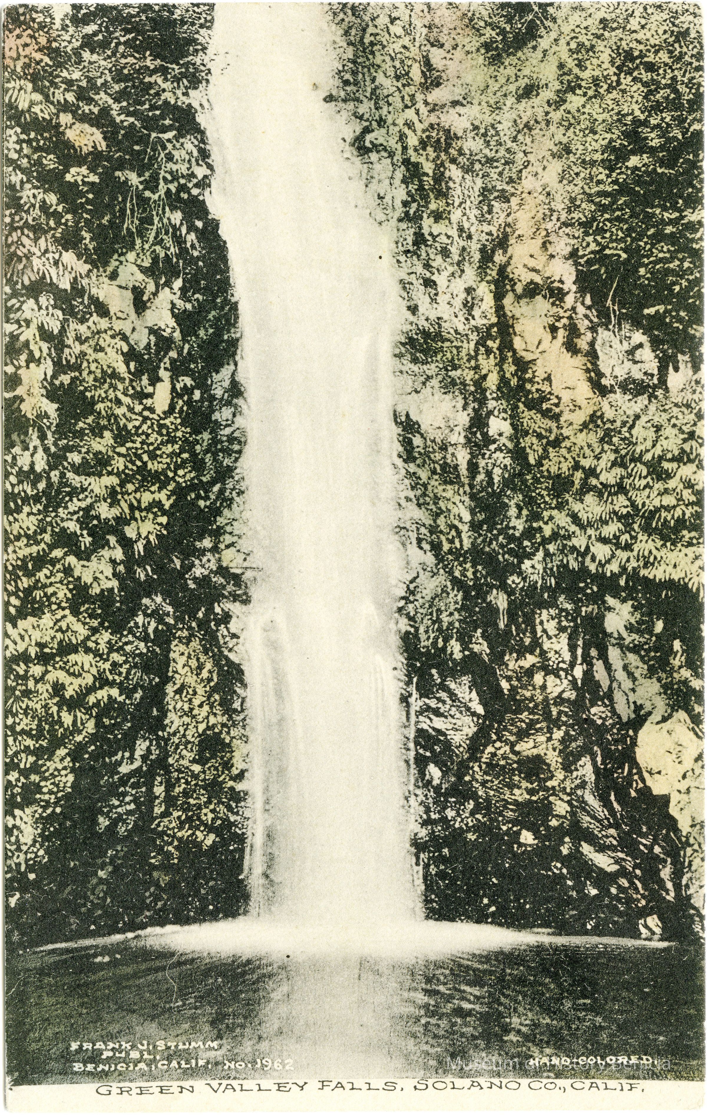 This is a divided back postcard. The photo is of Green Valley Falls in Green Valley. The card was published by Frank J. Stumm of Benicia, CA. The back is blank.Collection