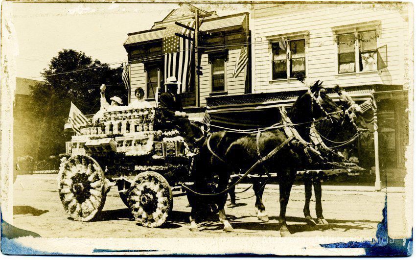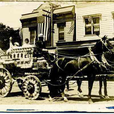 Postcard of a 4th of July float drawn by horses. The postcard is a Frank Stumm published postcard. The large flag hanging from one of the buildings looks like a 44 star flag but other smaller flags look like 48 star flags so the photo was probably taken after 1912. The float is carrying products from the Quinn store. In front is "Extra Star" kerosine and on the wagon it looks like other products.Collection