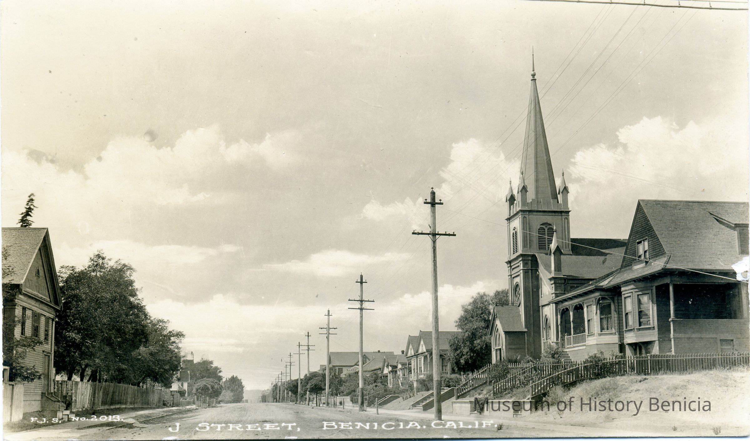 This is a photo postcard looking down "J" street in Benicia. The church just off First Street is on the right. The postcard was published by Frank Stumm.Collection