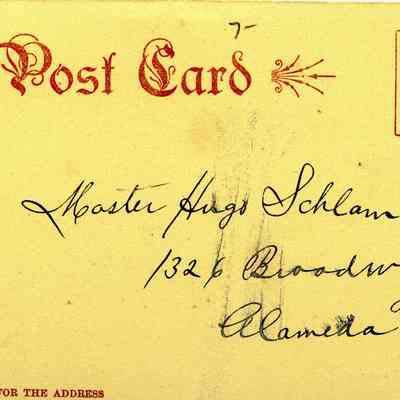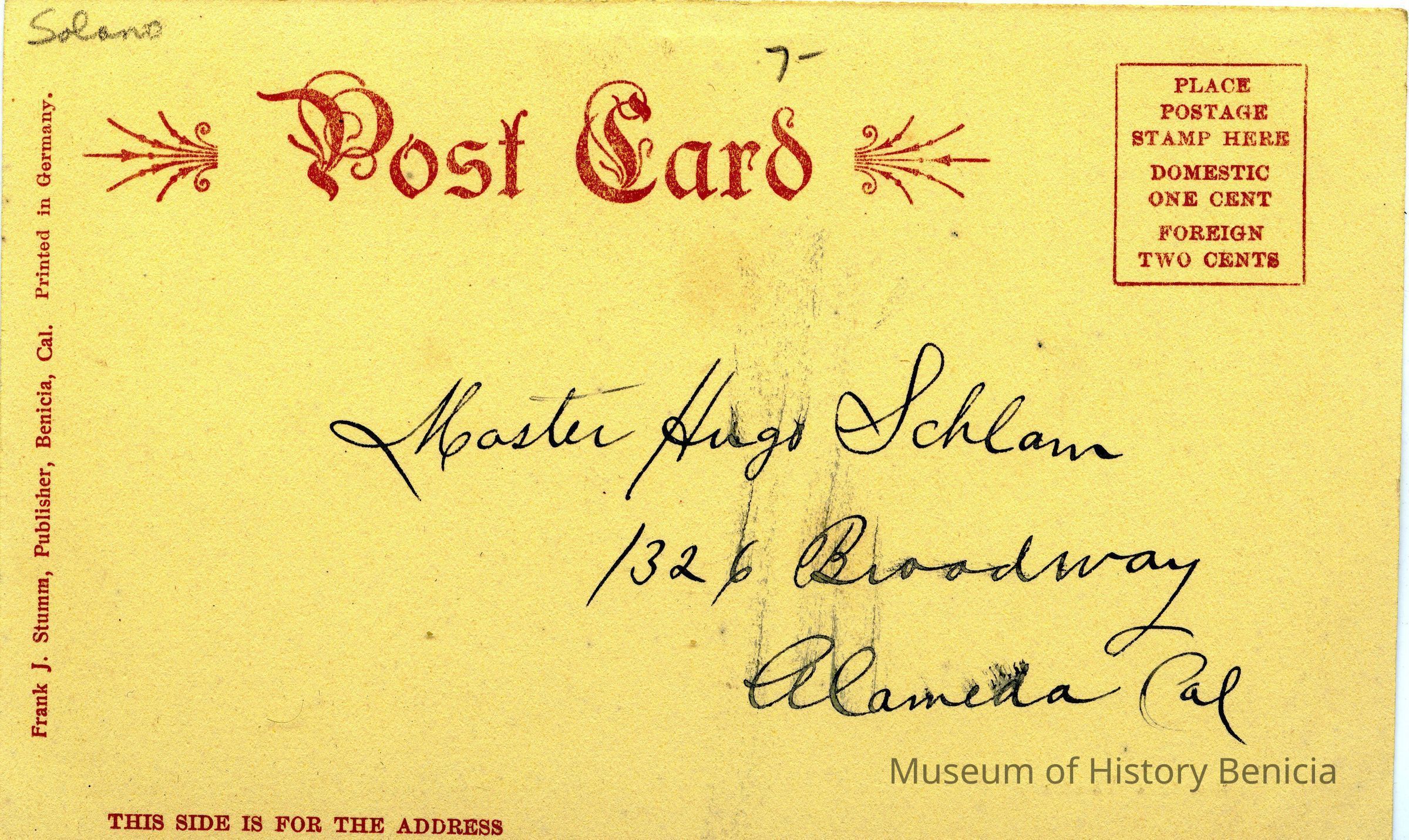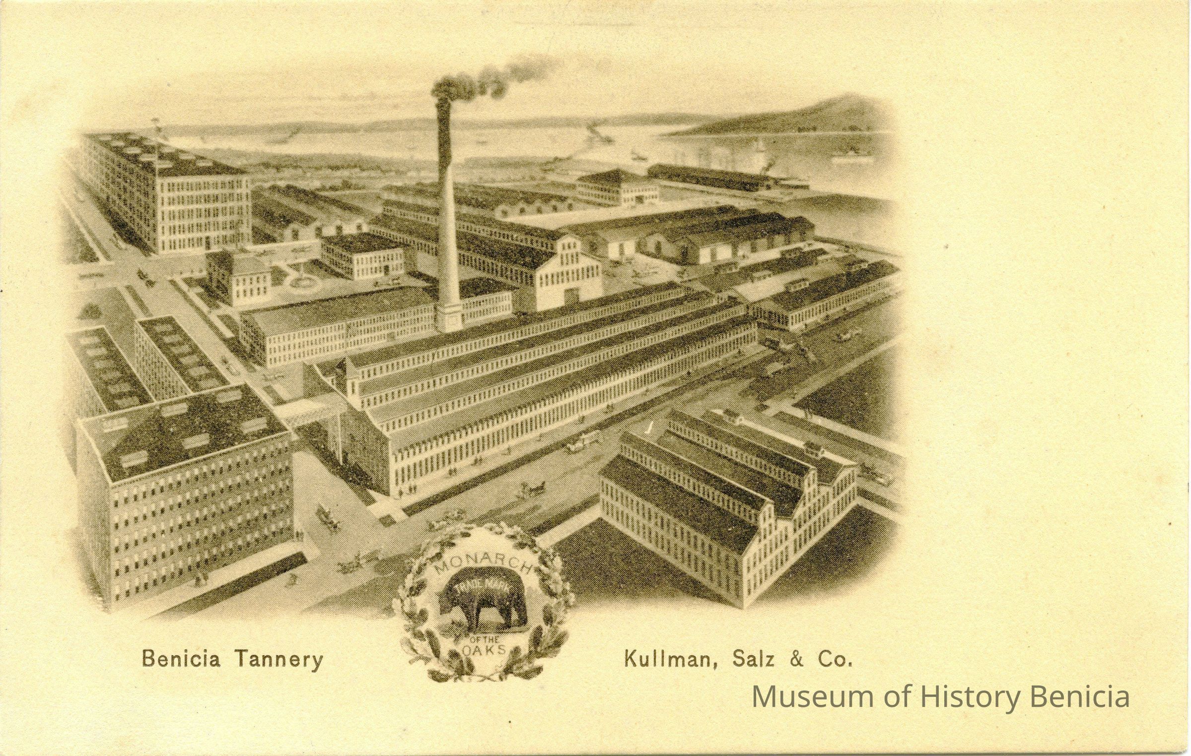 This is an address only back postcard of the Benicia Tannery owned by Kullman, Salz & Co.. It is sepia colored and was published by Frank J. Stumm Publisher Benicia, Cal and printed in Germany. The caption is "Benicia Tannery" and "Kullman, Salz & Co." The back is addressed to Master Hugo Schlam of Alameda, Ca..Collection