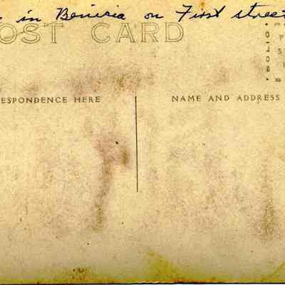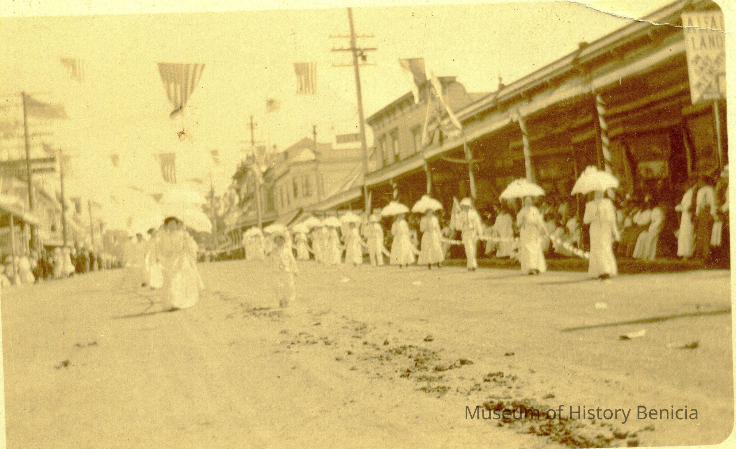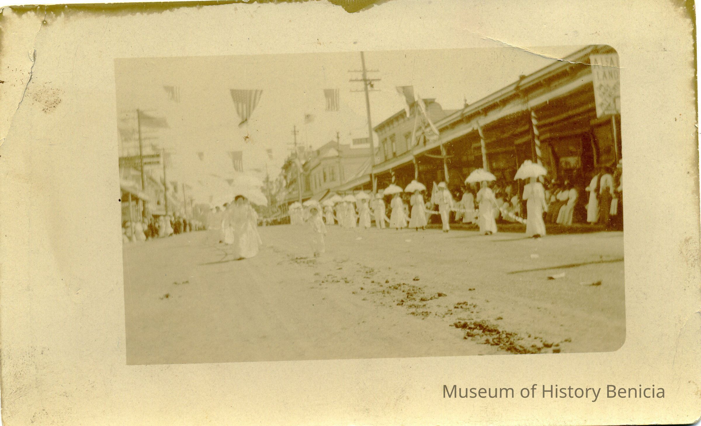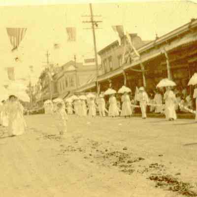 Postcard of a parade on First Street Benicia. Shows a line of women dressed in white.
