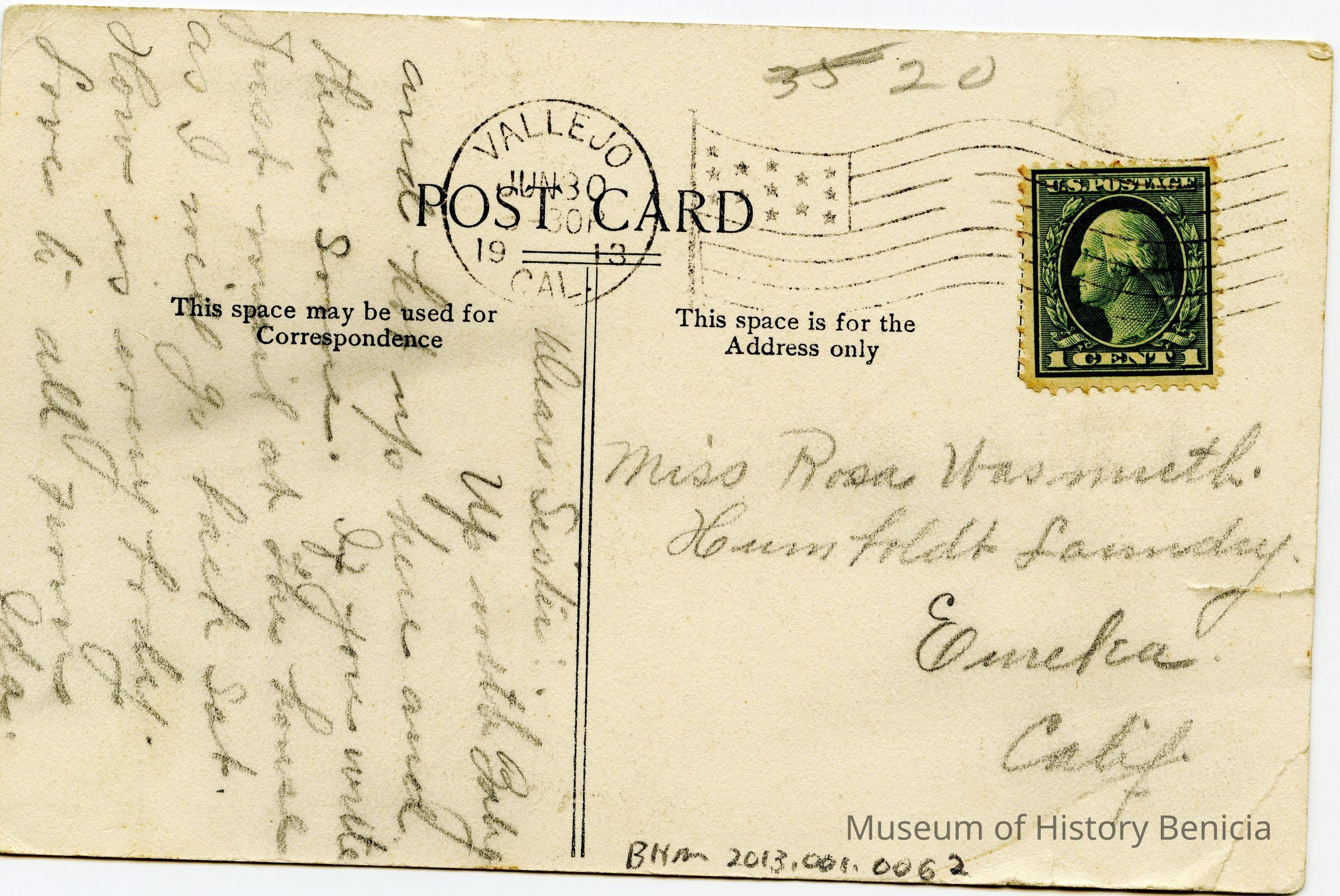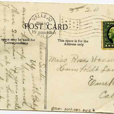 The back is addressed to Miss Rosa Wasmuth in Eureka, CA.Collection