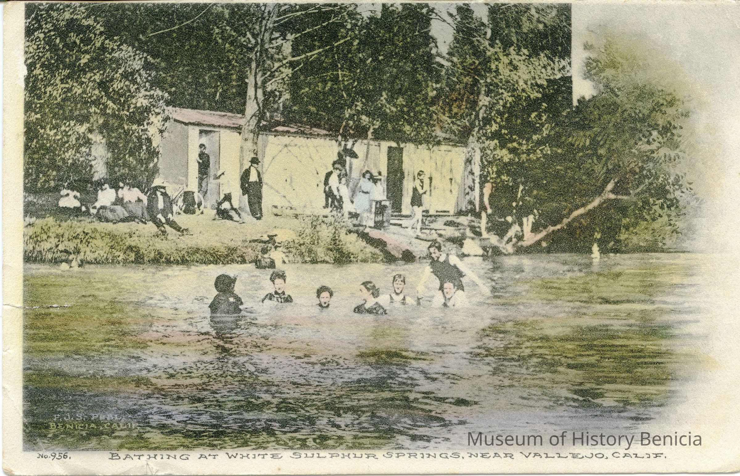 This is a divided back postcard of bathing at White Sulfur Springs in Vallejo. (This is now Blue Rock Springs park.) It is marked Frank J Stumm Publisher Benicia, CA. It is a picture of the lake with several people swimming and others at the bath house.