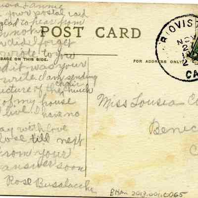 The back is addressed to Miss Louisa Costa of Benica (sic) California. It is from Rose Busalacche.Collection