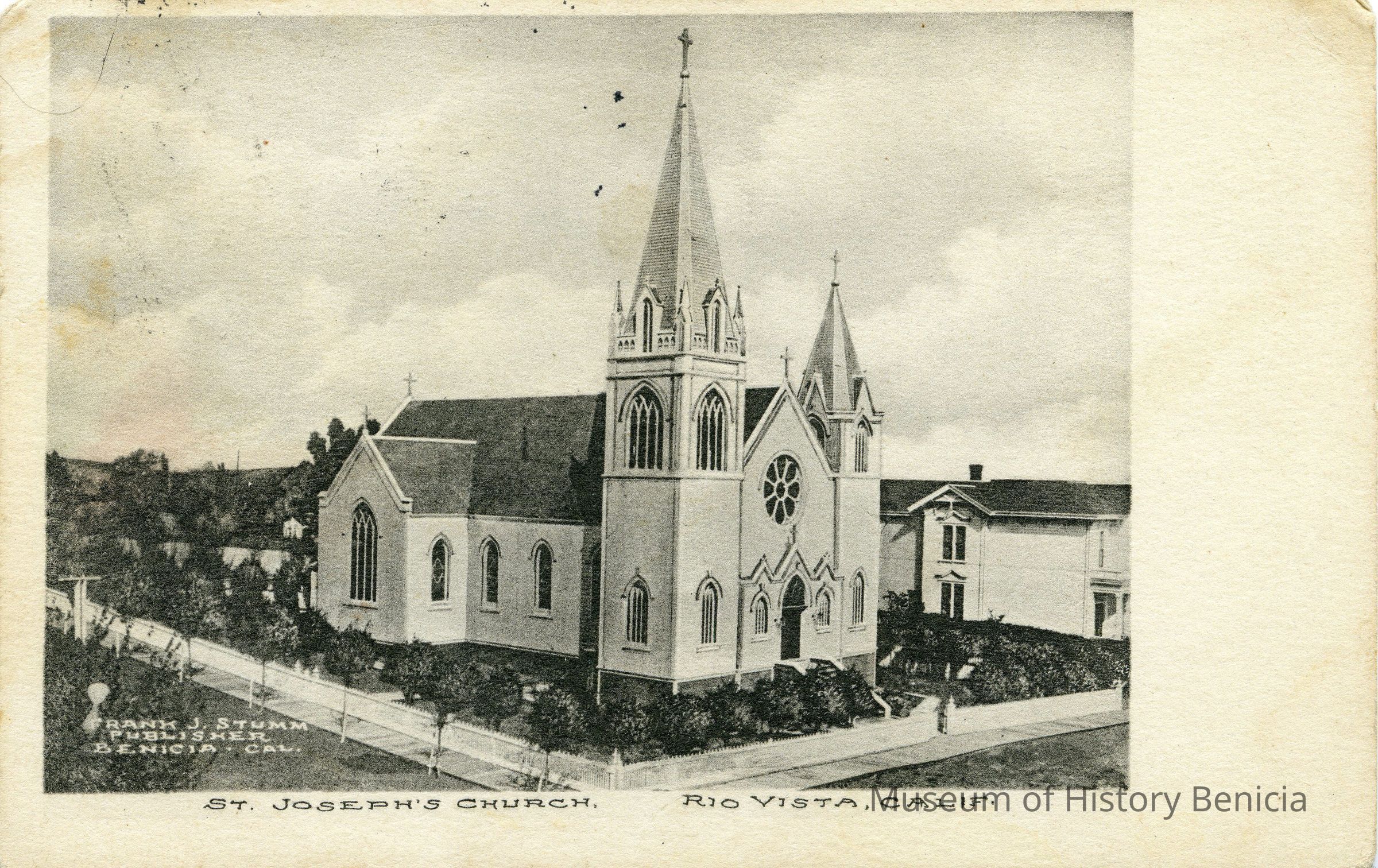 This is a divided back postcard of St. Joseph's church in Rio Vista. It is marked Frank J Stumm Publisher Benicia, CA. It is a picture of the church with a white border around the photo.