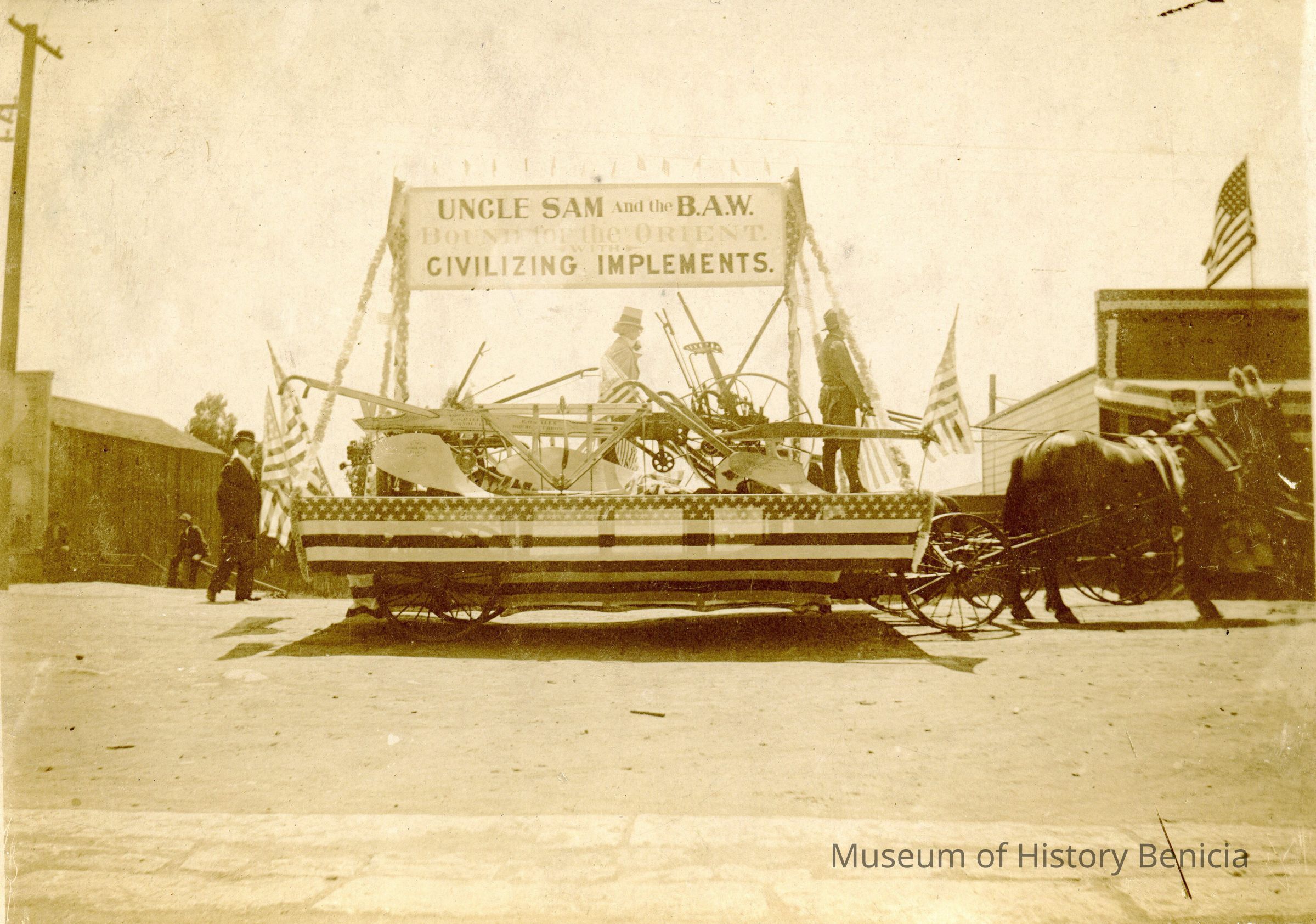 This is a photograph of a parade float from the Benicia Agricultural Works in Benicia. It is a horse drawn float with various farming implements, flags and two people riding on top. The sign says "Uncle Sam and the BAW" then "bound for the Orient with Civilizing Implements".