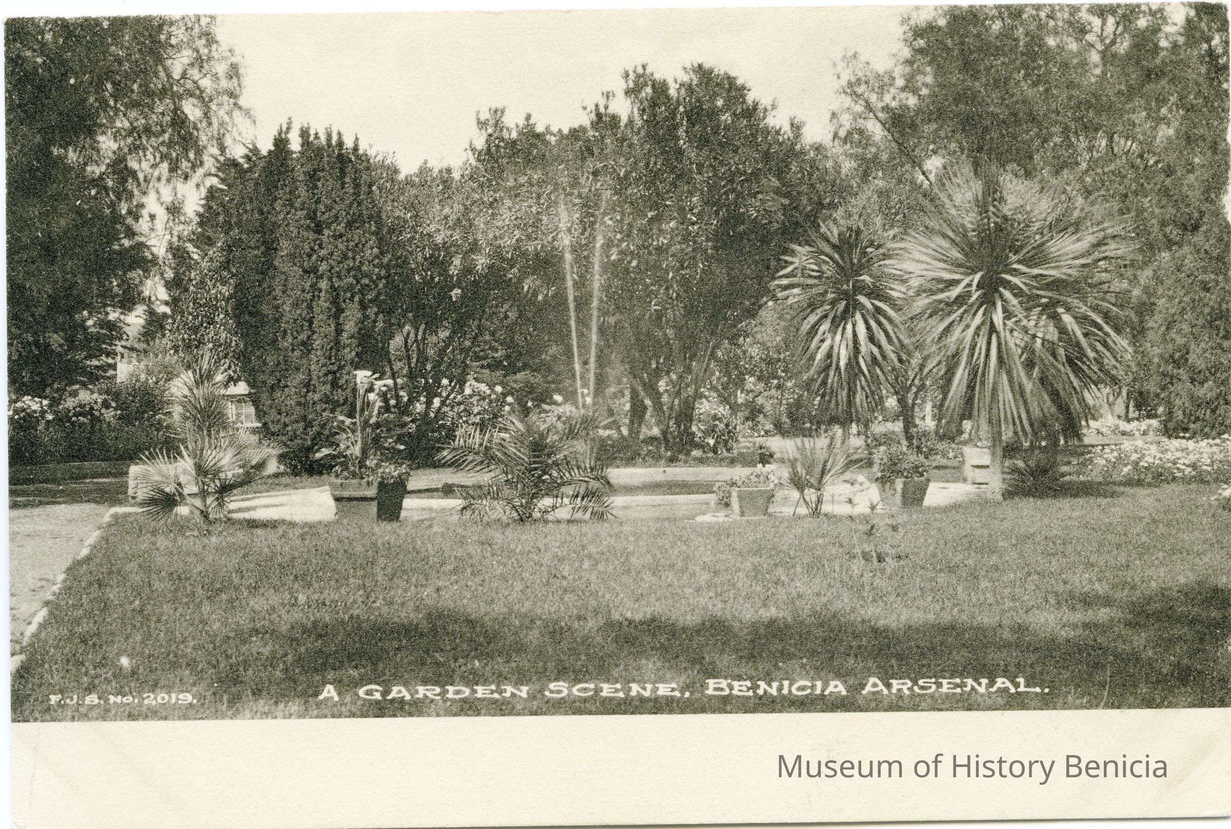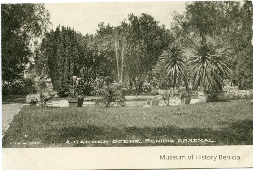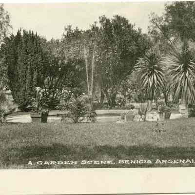 This is a divided back postcard of a garden at the Benicia Arsenal. It was published by Frank J. Stumm of Benicia. The back is blank.