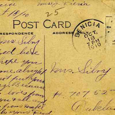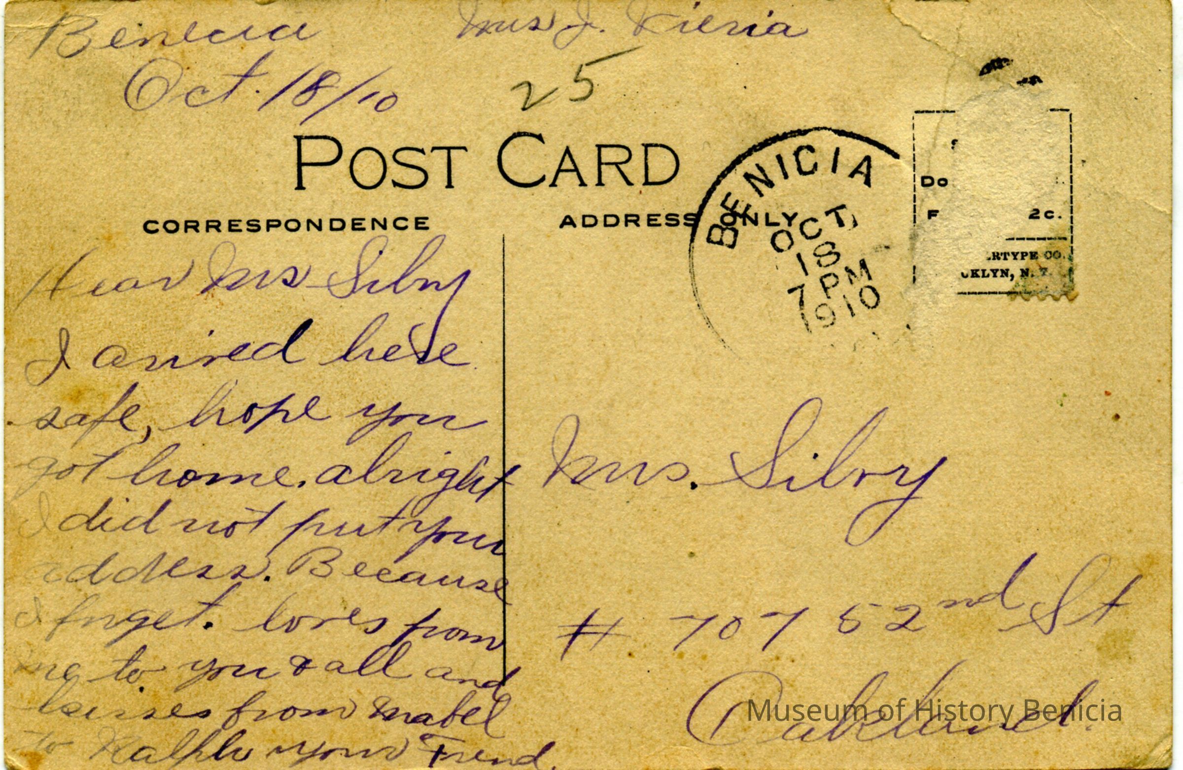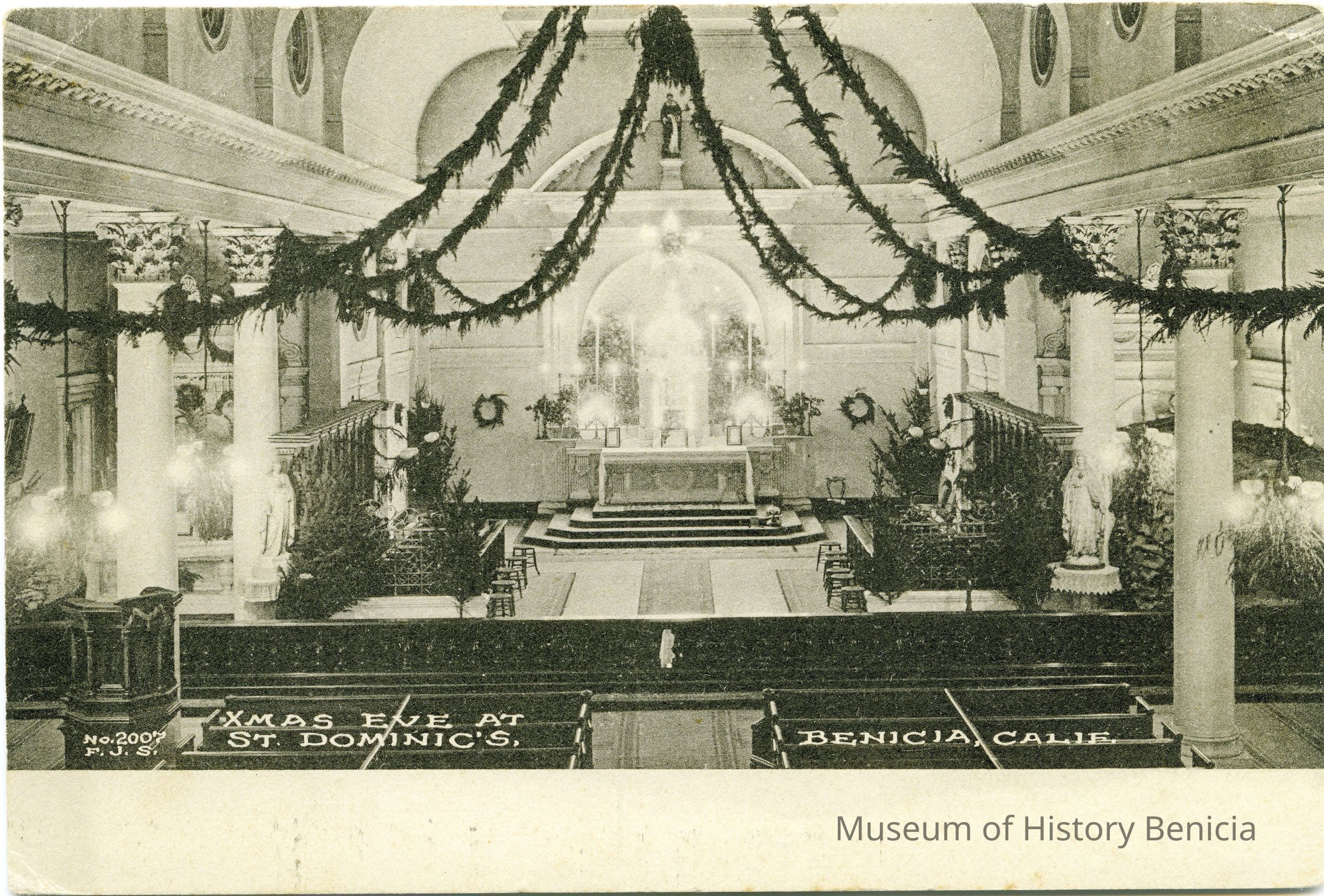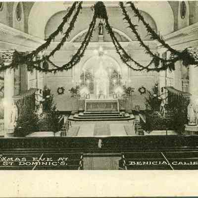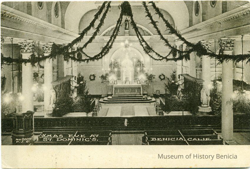 This is a divided back postcard. The photo is of Christmas at St. Dominics in Benicia. It was published by Frank J. Stumm of Benicia. The back is addressed to Mrs. Silvy of Oakland, CA. The message says that the writter made it home safe.Collection