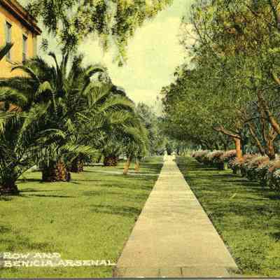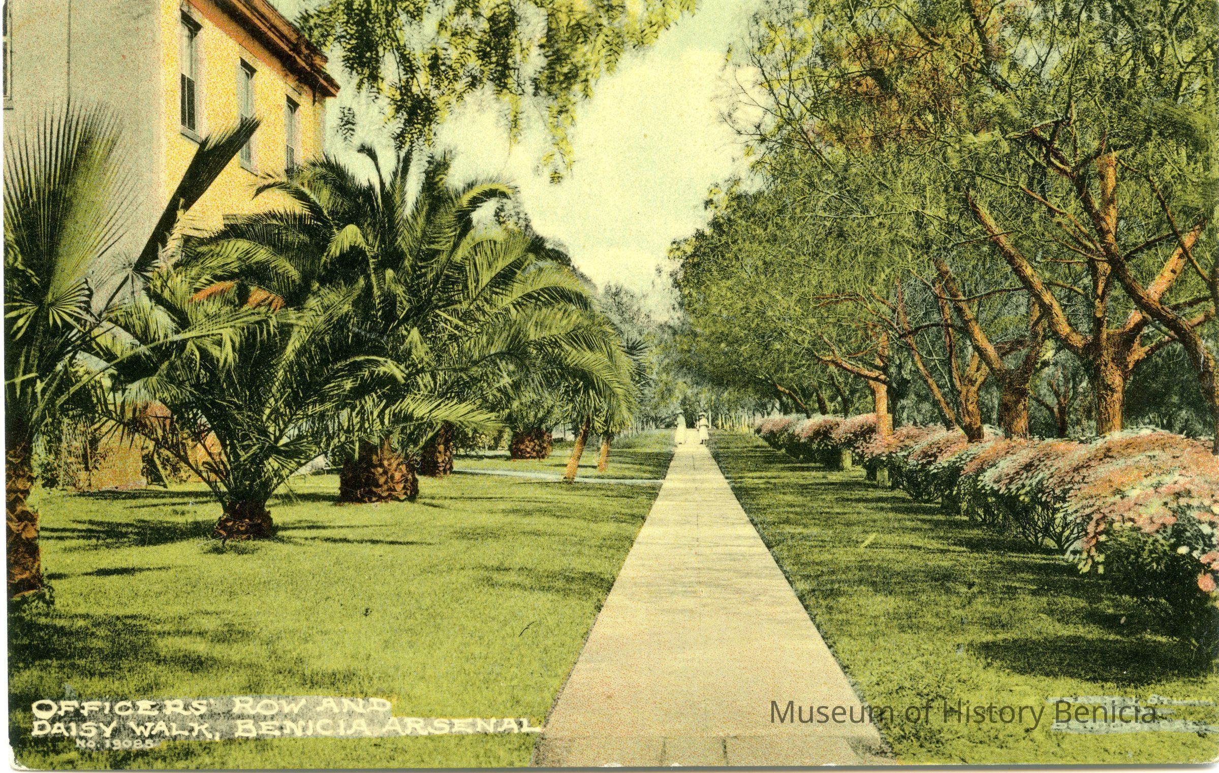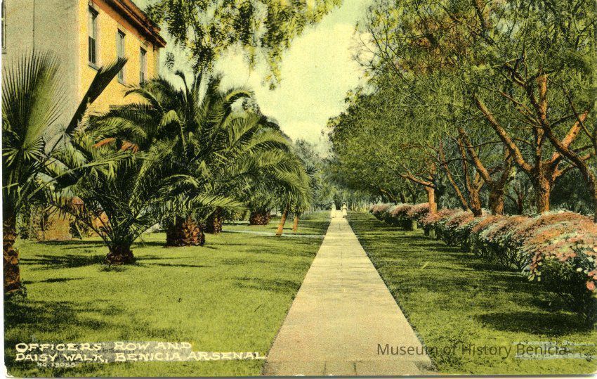 This is a divided back colorized postcard. The photo is of Officer's Walk in the Benicia Arsenal. It was published by Frank J. Stumm of Benicia. The back is blank.Collection