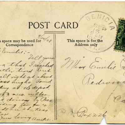 The card was sent to Miss Emilie P. Jones in Redwood California. It is from her aunt and just wants to say that she reached home safely. It is dated 1908.Collection