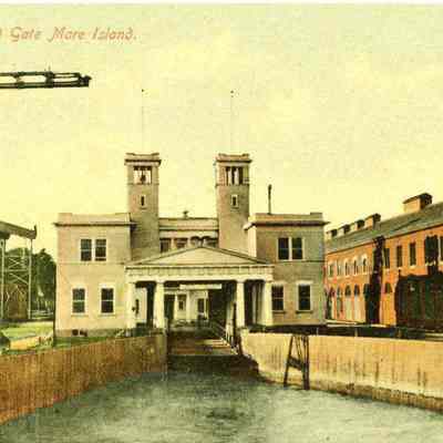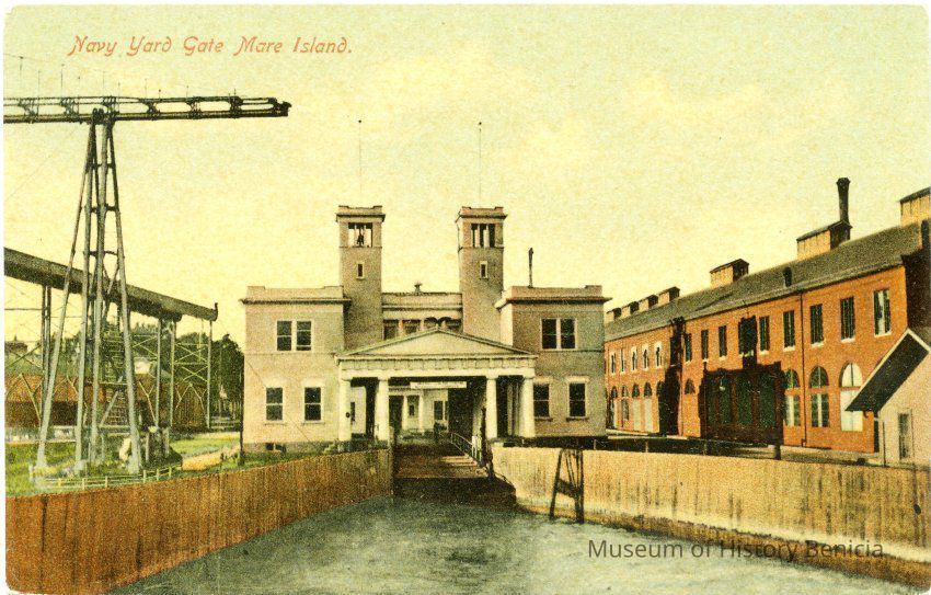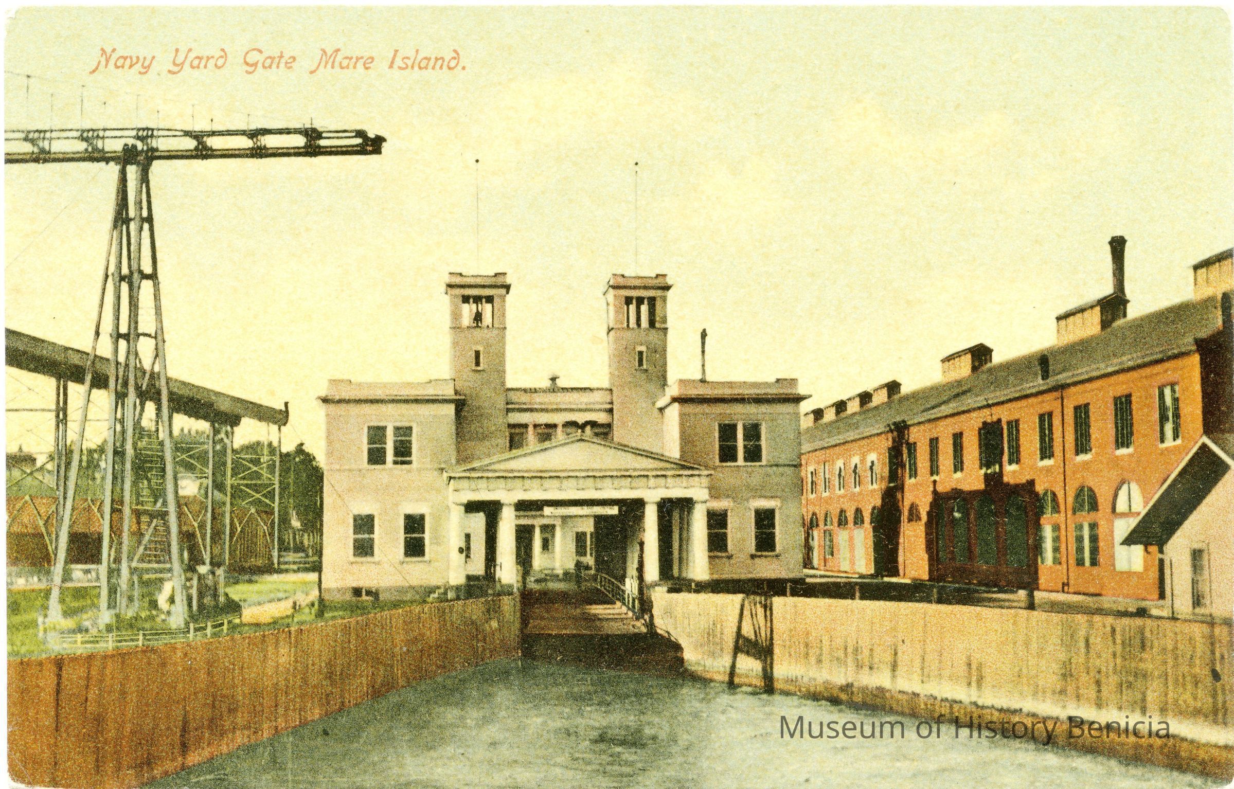This is a divided back colorized postcard. The photo is of the Gate at Mare Island. It was published by Frank J. Stumm of Benicia. The back is blank.Collection