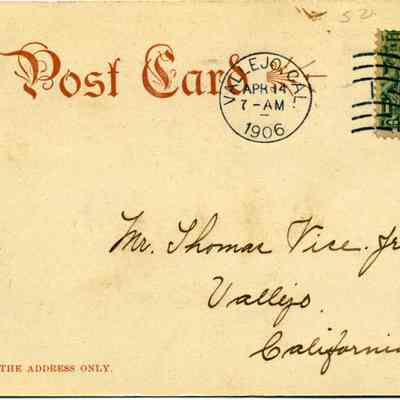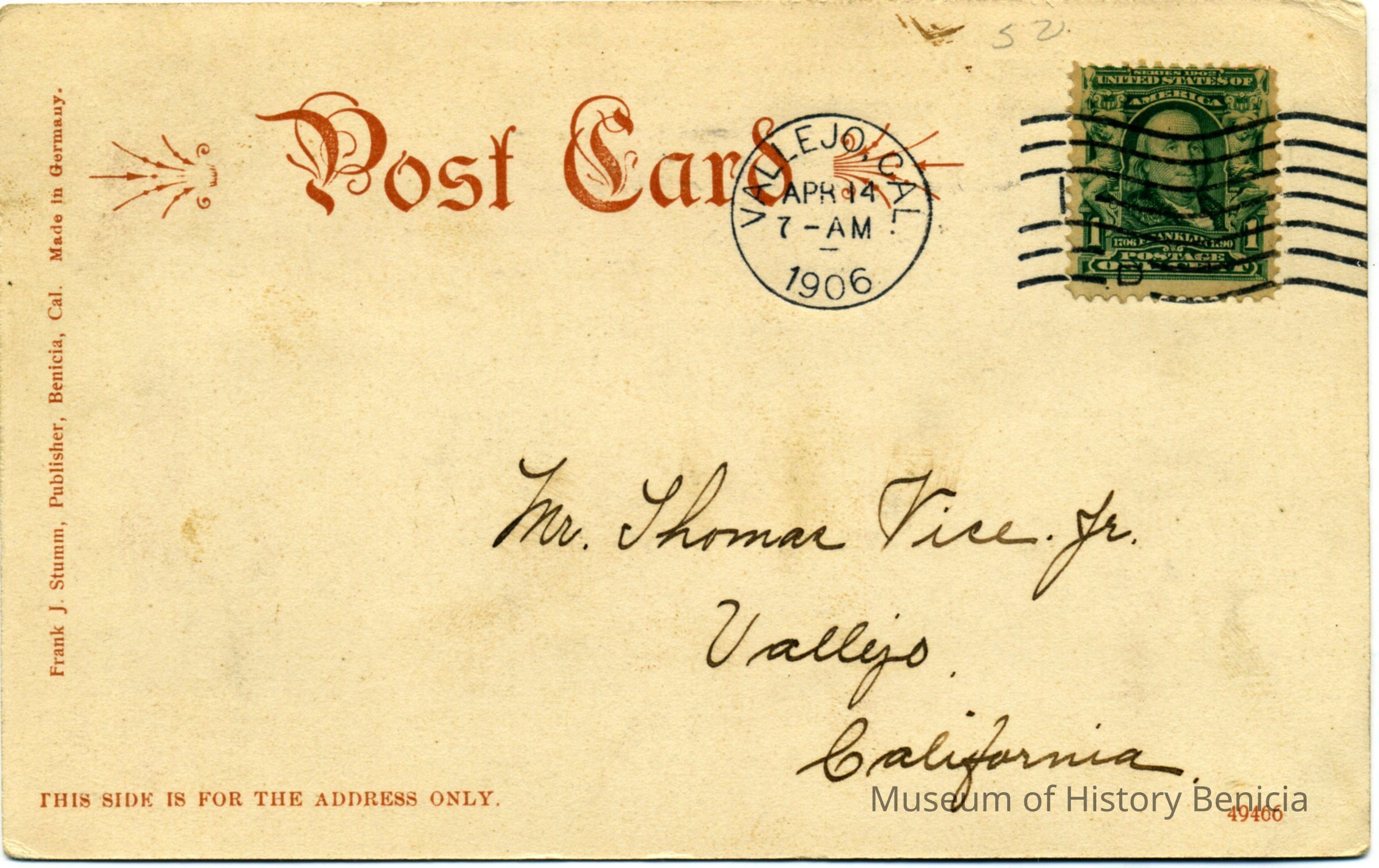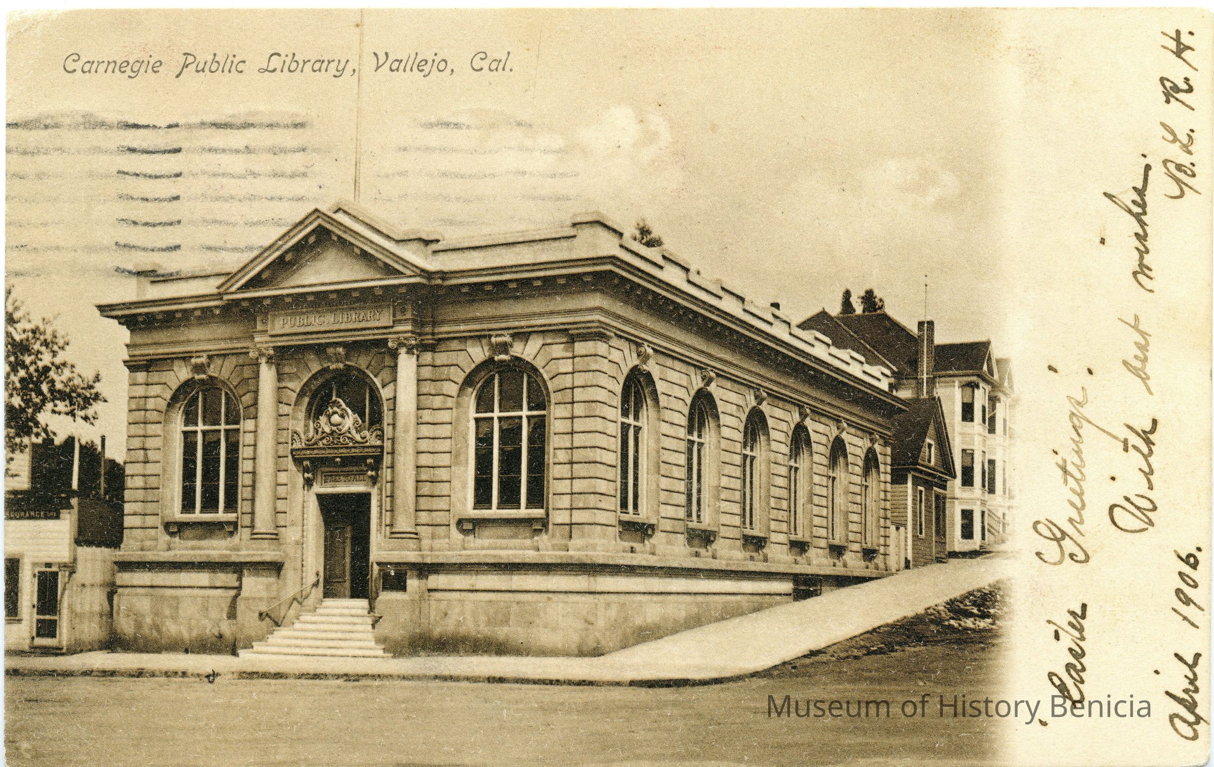 This is an undivided back postcard of the Carnegie Public Library in Vallejo. The card is being used as an Easter Greeting card. It is addressed to Mr. Thomas Vice Jr. in Vallejo.Collection