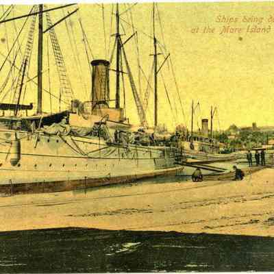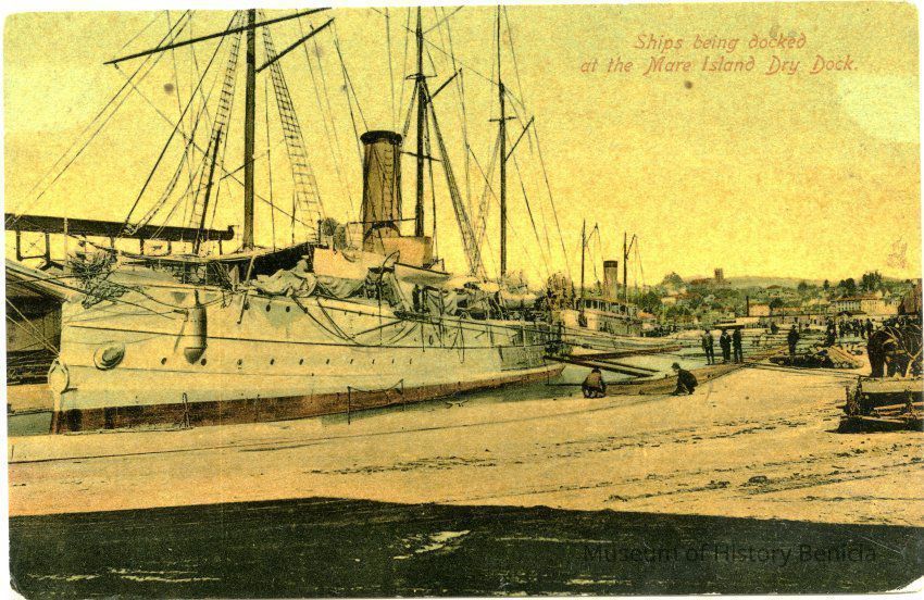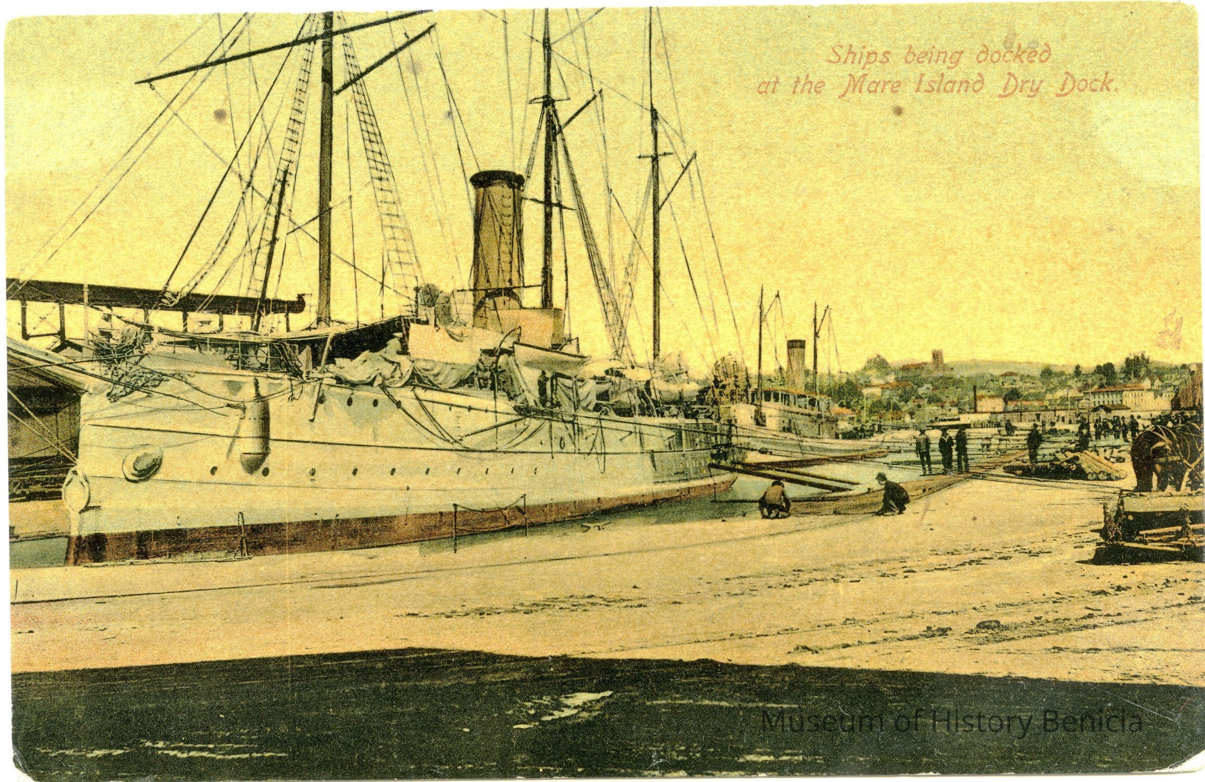 This is a divided back colorized postcard. The photo is of ships at the Mare Island dry dock. It was published by Frank J. Stumm of Benicia. The back is blank.Collection