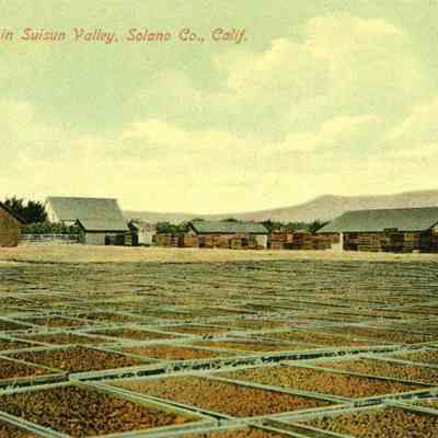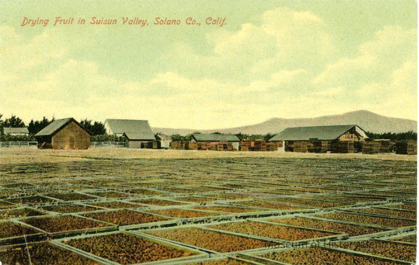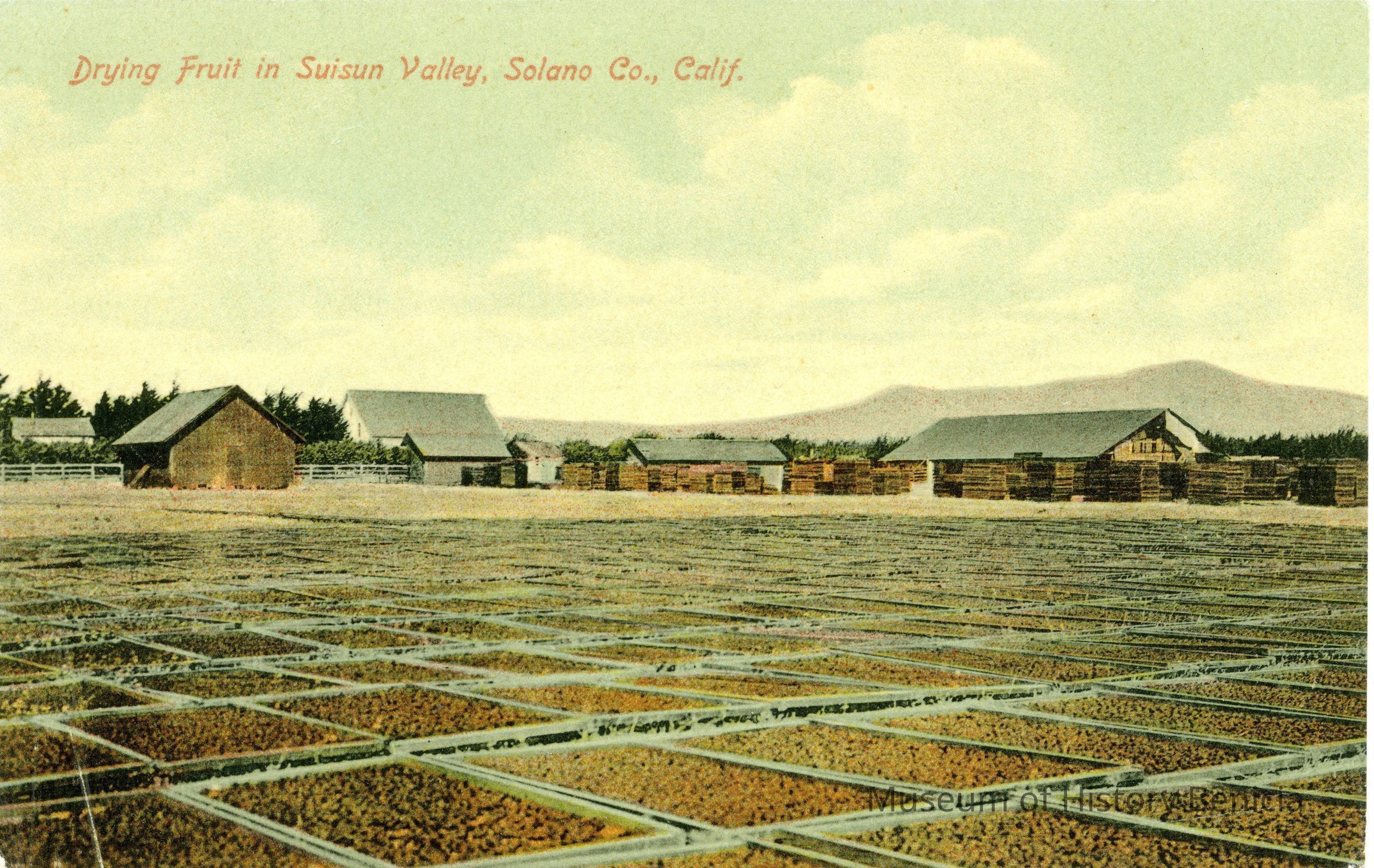 This is a divided back colorized postcard of a fruit drying ground in Suisun. It is published by Frank J. Stumm of Benicia. The back is blank.Collection