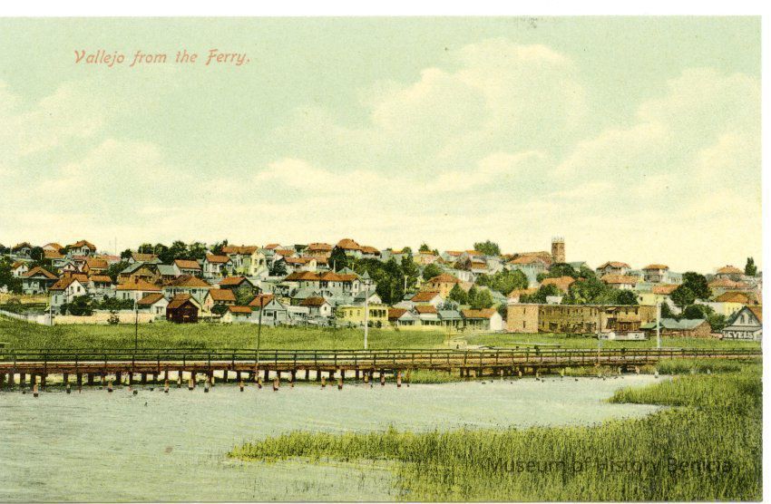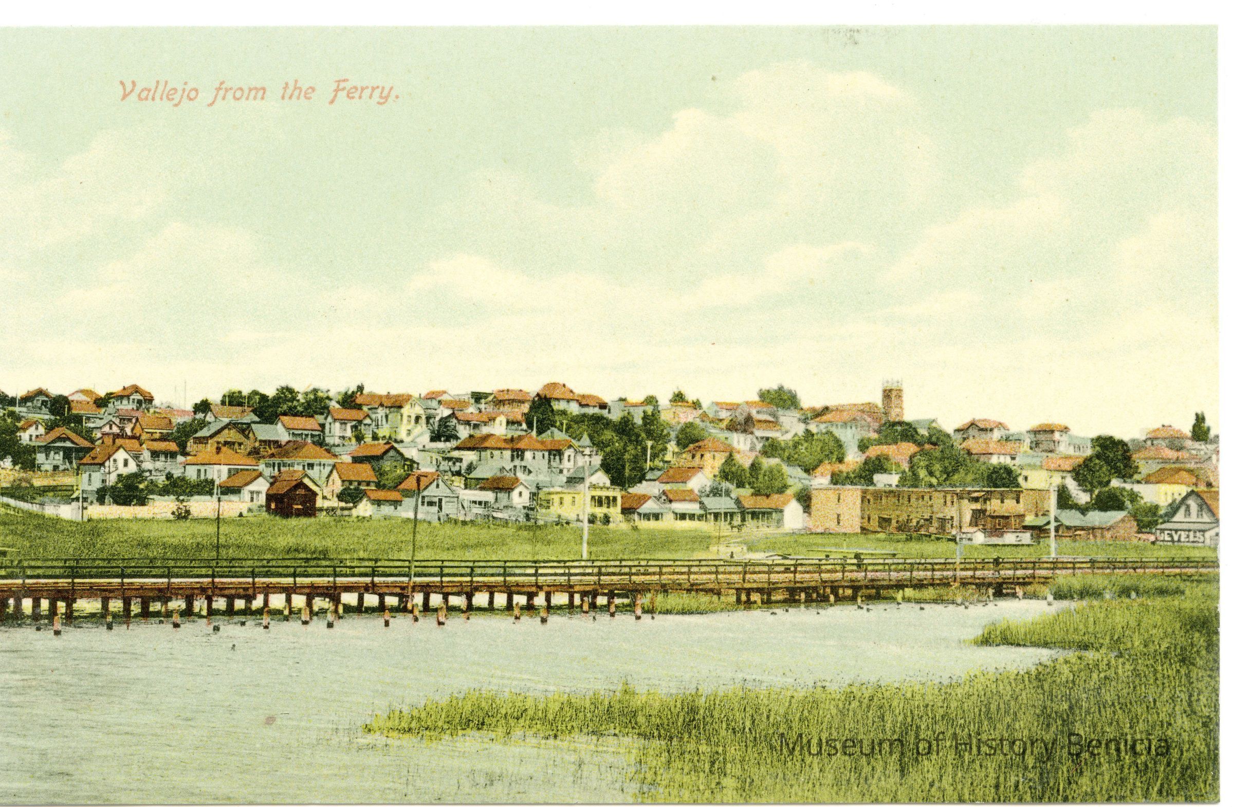 This is a colorized divided back postcard of Vallejo, CA from the ferry. It is published by Frank J. Stumm of Benicia. The back is blank.