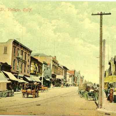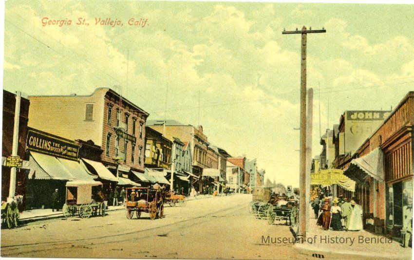 This is a colorized divided back postcard of Georgia Street in Vallejo, CA. It is published by Frank J. Stumm of Benicia. The back is blank.
